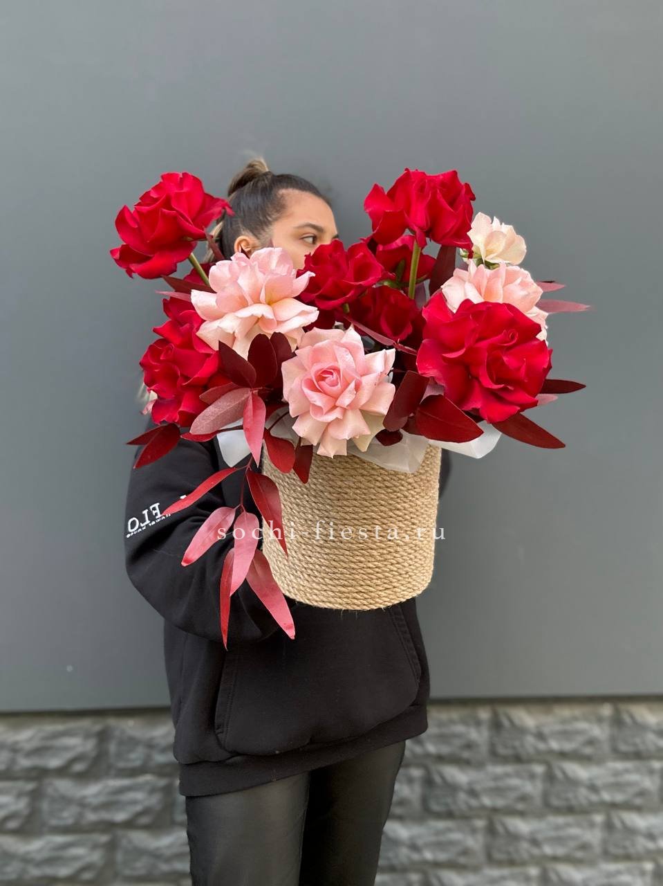 французские красные розы в корзине.