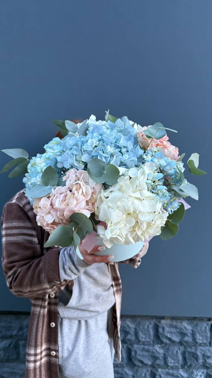 Семь гортензий в плетёной корзине держат форму и долго радуют свежестью. Компактная композиция удобна для размещения на столе или комоде без лишних хлопот.