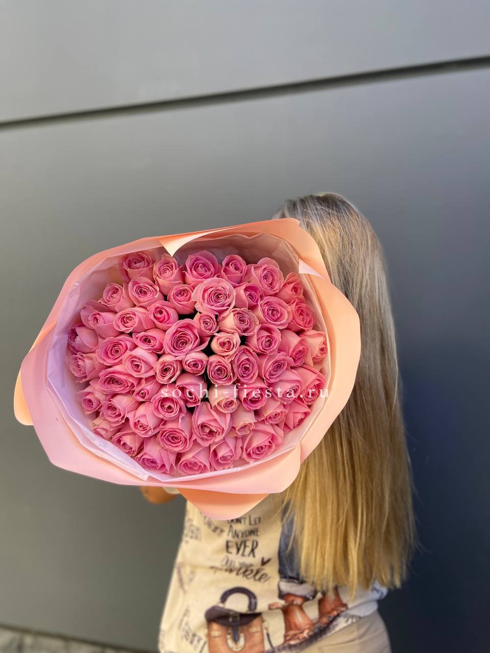 Пятьдесят пять бутонов создают объемную композицию с выразительным силуэтом. Розовый цвет наполняет пространство светом. Авторское оформление завершает образ.
