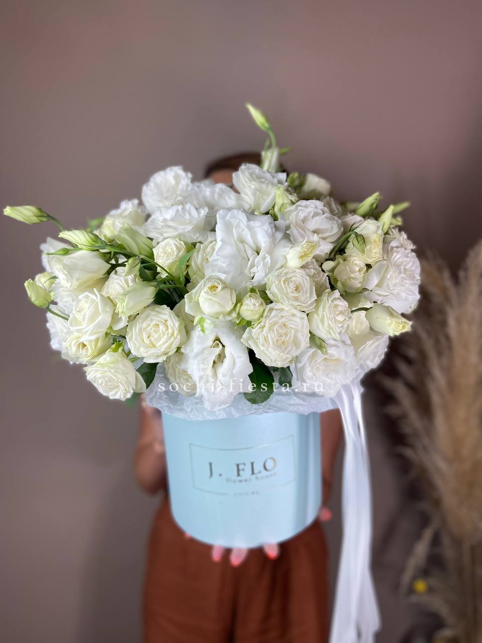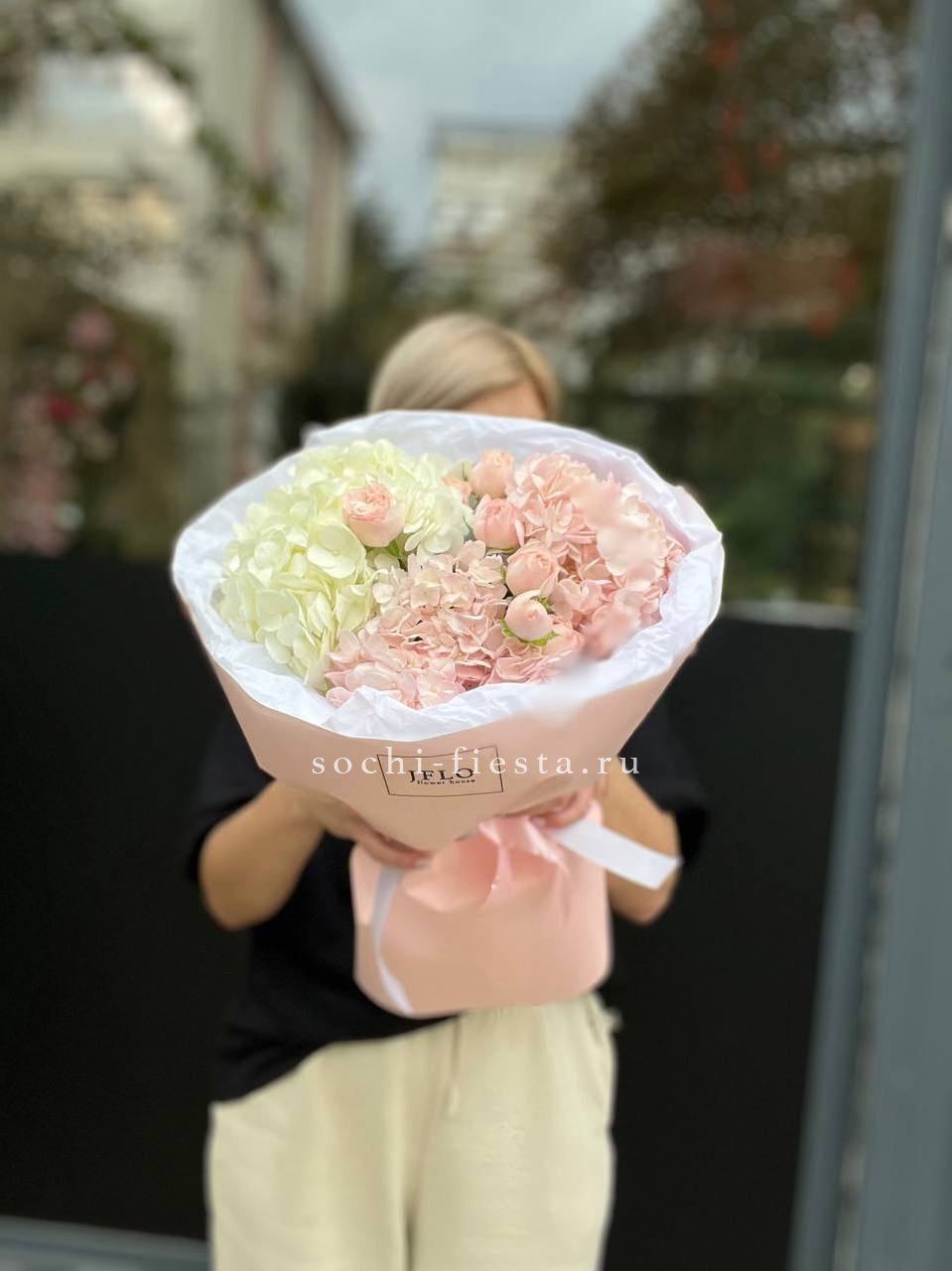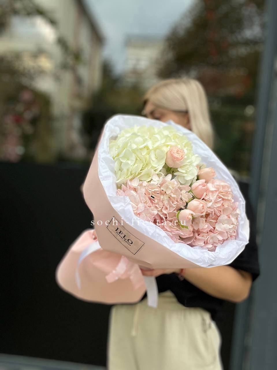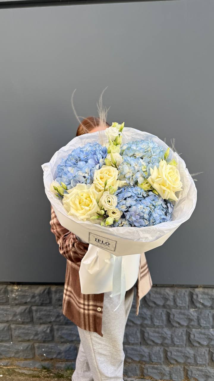 Сочетание пышной голубой гортензии и классических белых роз — это гимн нежности и чистоты. Букет, который не просто удивляет своим масштабом, но и дарит ощущение безмятежности. Идеальный выбор для самого искреннего признания.