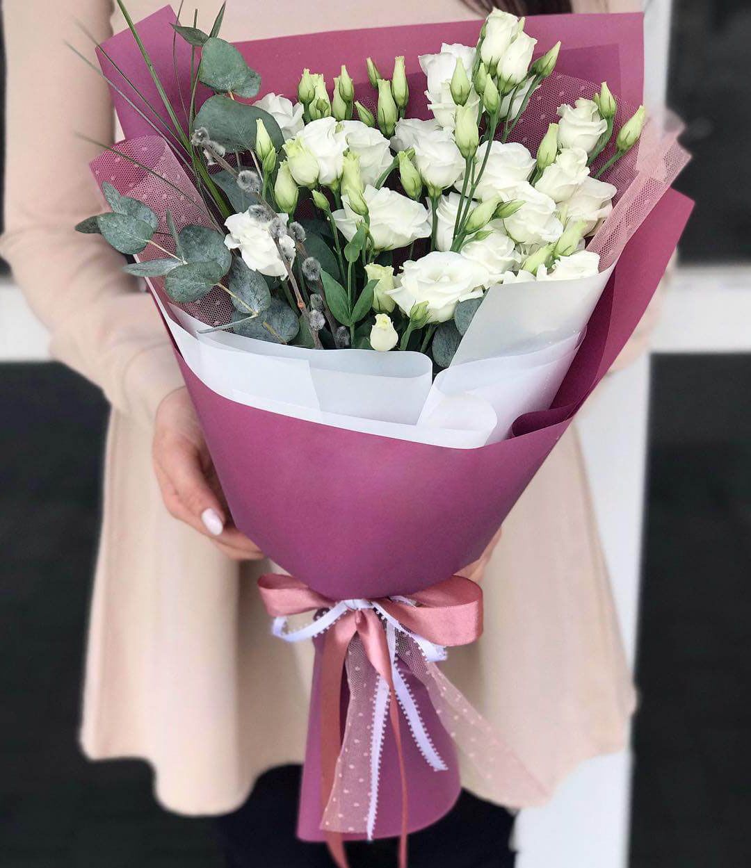 белая эустома под ленту.
