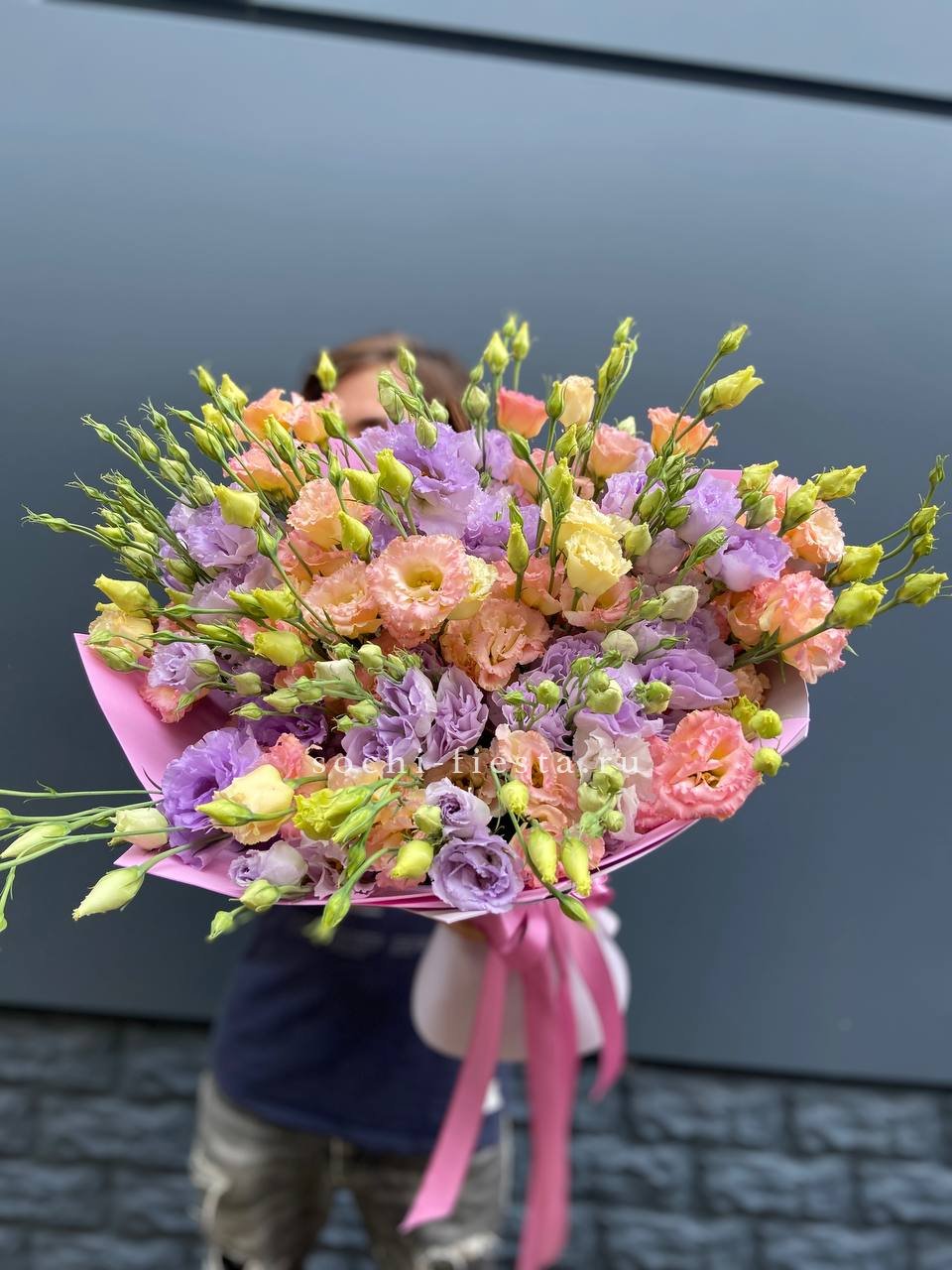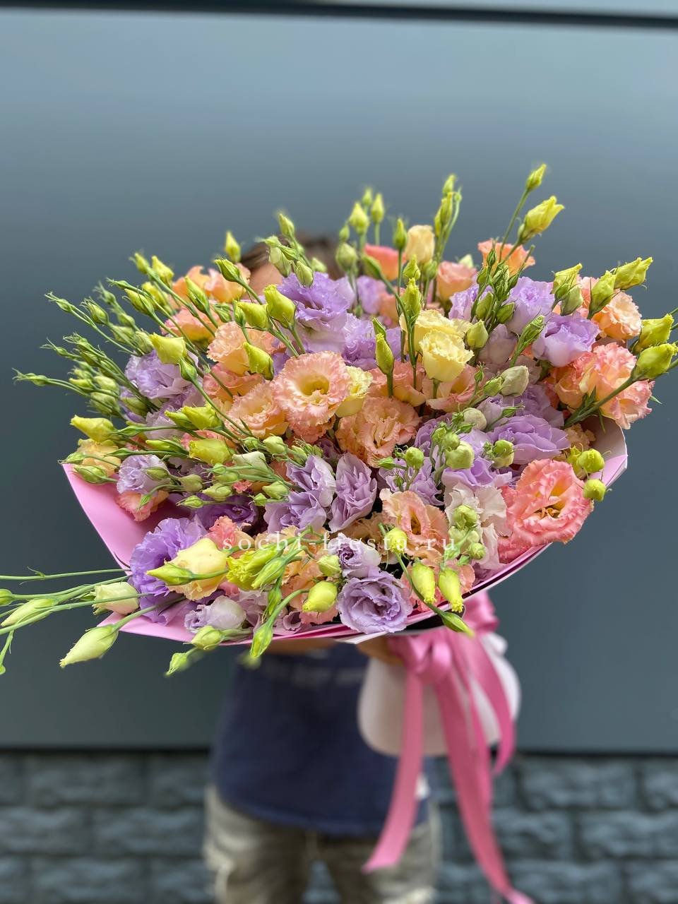 Многоцветковые ветки эустомы в розовой гамме образуют пышное облако из полураскрытых бутонов. Дизайнерская упаковка поддерживает воздушную структуру композиции.
