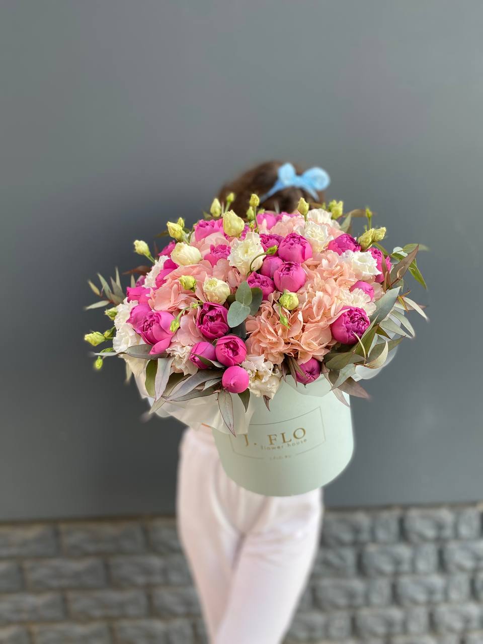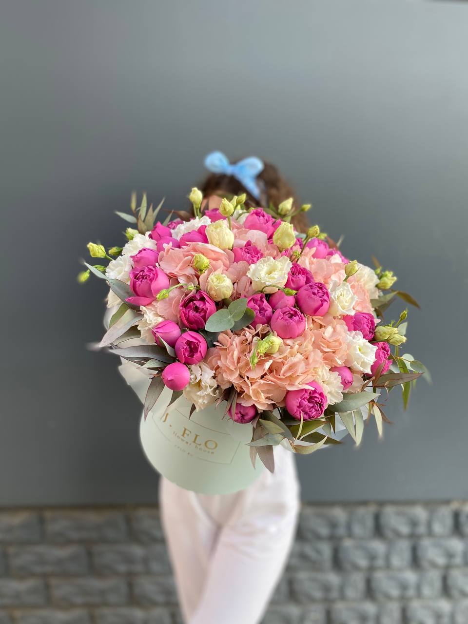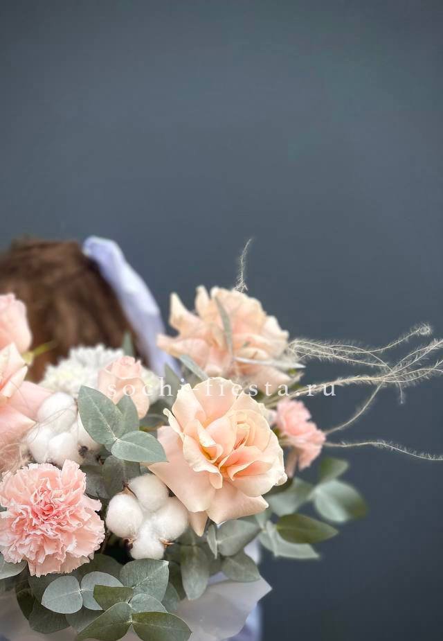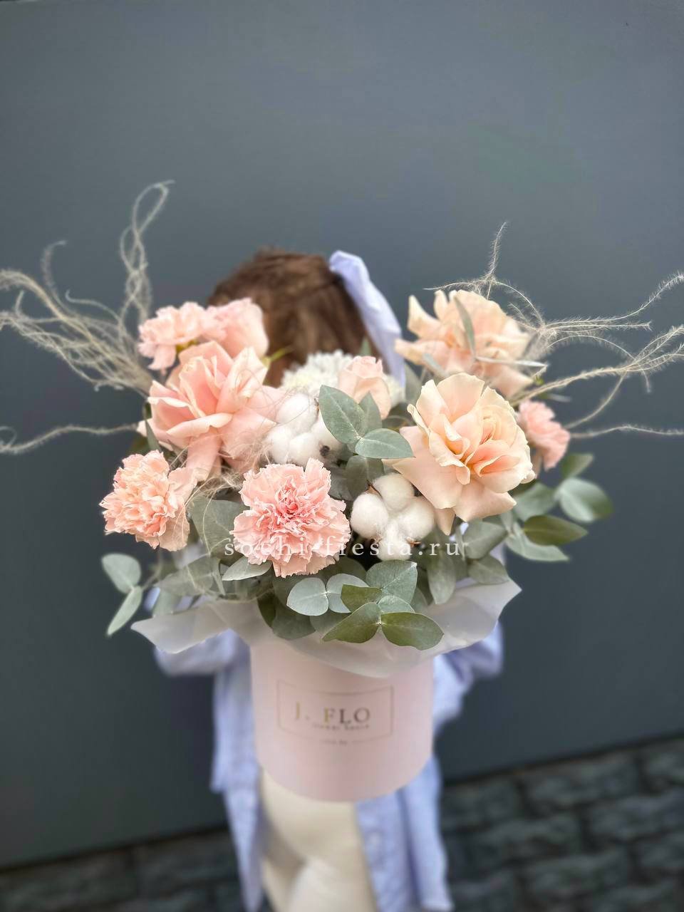 Пышная гортензия задает объем, а французские розы и эустома создают многослойную глубину. Диантусы добавляют графичные точки, эвкалипт обрамляет композицию мягкими линиями.