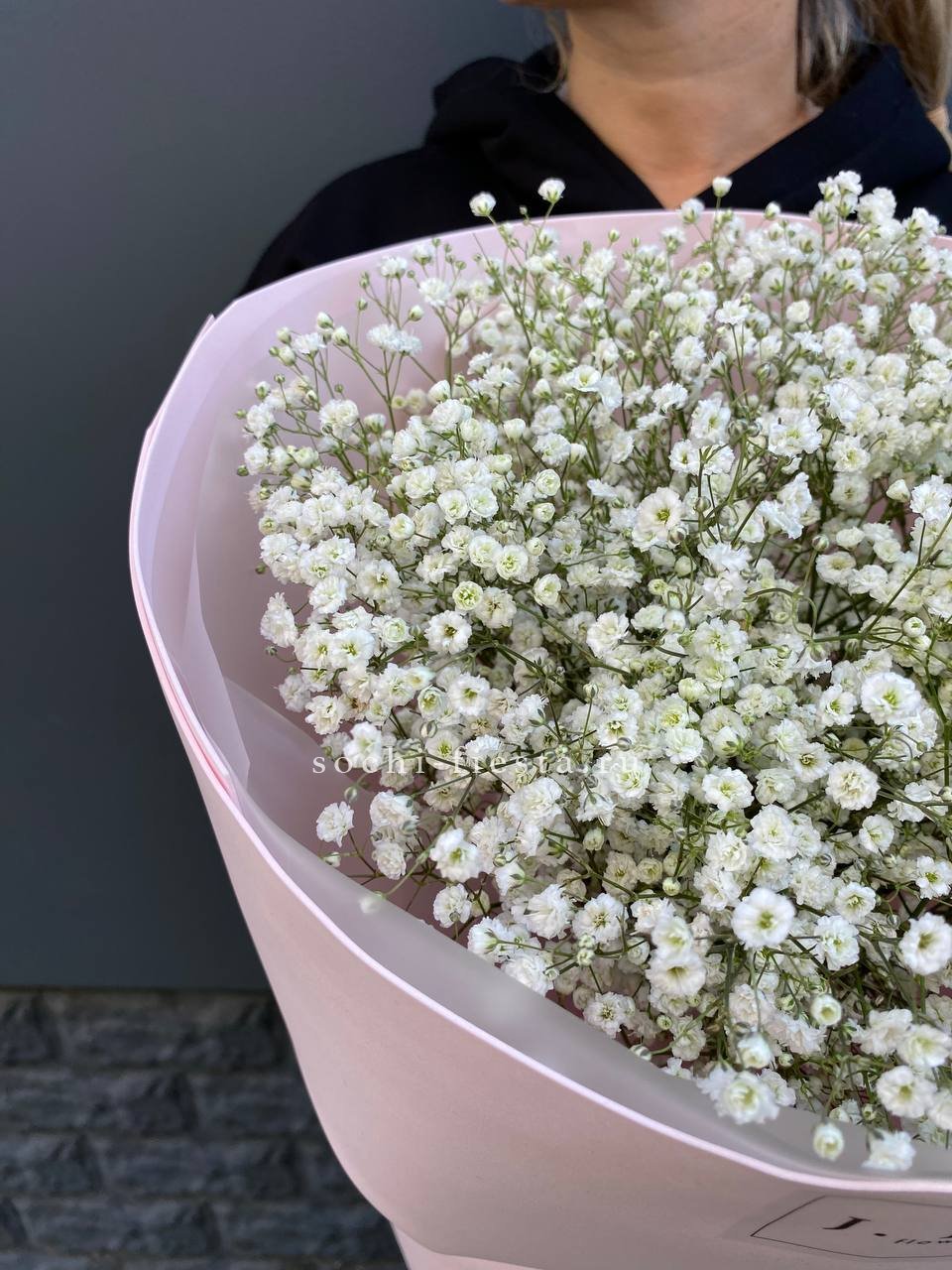Одиннадцать веток гипсофилы с мелкими соцветиями в комбинированной упаковке из фоамирана. Белые облачка цветов сохраняют форму и долго радуют глаз.