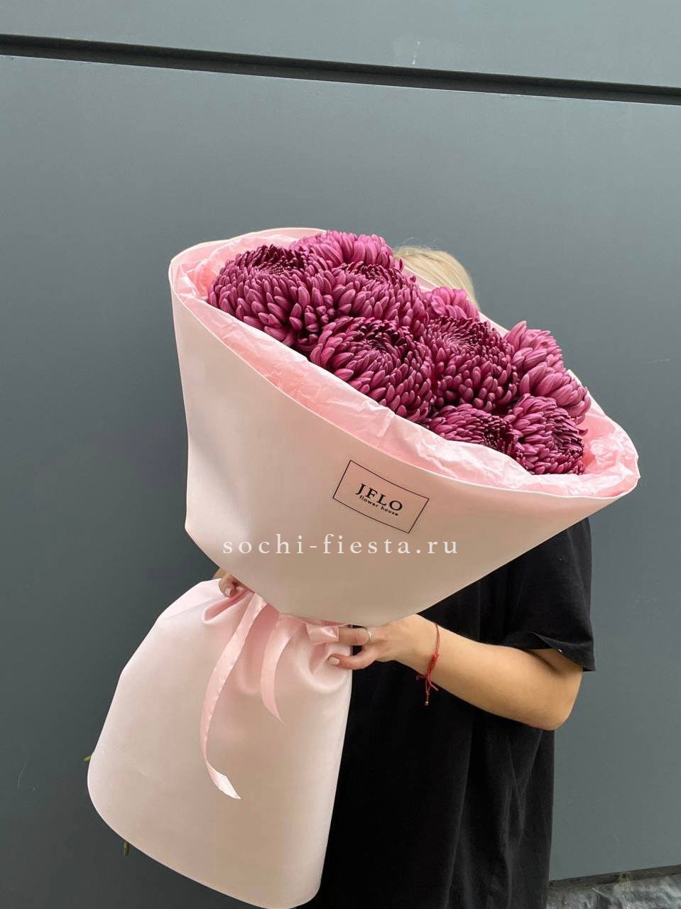 Девять хризантем бигуди выстраиваются в воздушную композицию с игольчатыми лепестками. Каждый бутон раскрывается лучистой звездой, создавая объёмную фактуру и динамичный силуэт.