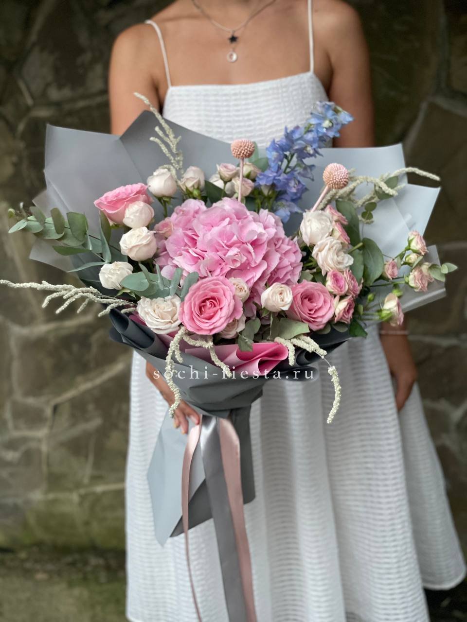 гортензии, роза одноголовая, роза кустовая, гербера, озотамнус, диантус, эвкалипт, декоративные перья, лента, дизайнерская упаковка.
