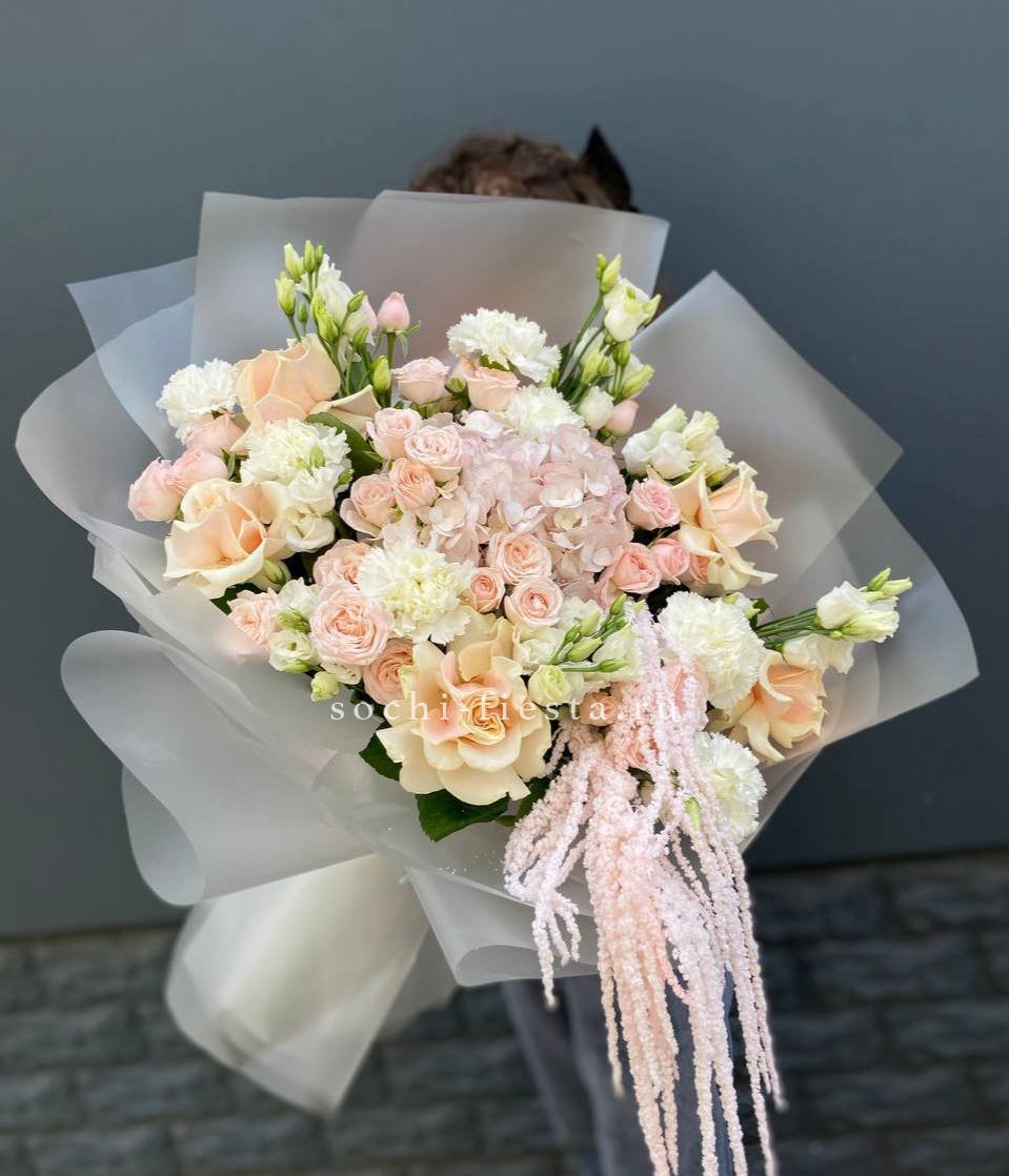 Персиковые оттенки переплетаются с пудрово-розовыми тонами в свободной авторской сборке. Гортензия и эустома задают объём, а мелкие соцветия диантуса и бовардии добавляют воздушности. Композиция с естественным силуэтом и матовой зеленью эвкалипта.
