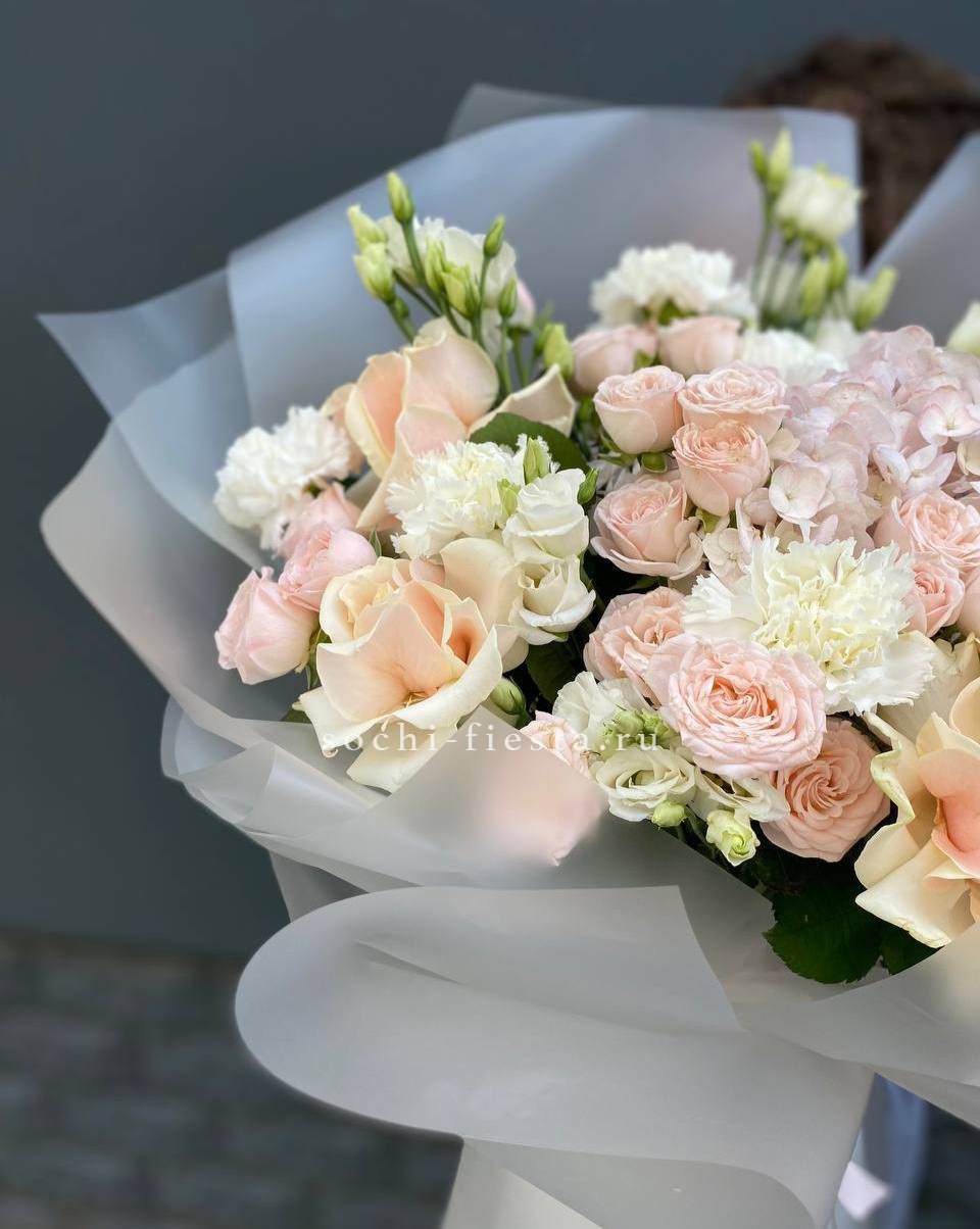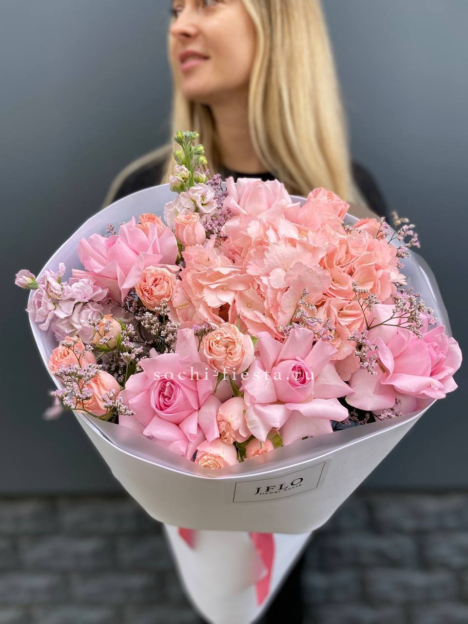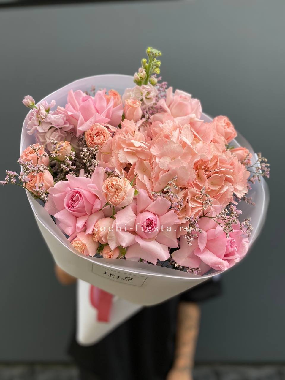 гортензия, диантус, мисти бабблс, астильба или аналог, гербера, кустовая роза, бовардия, эустома, эвкалипт, авторская упаковка, лента.