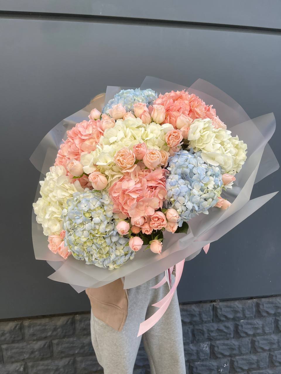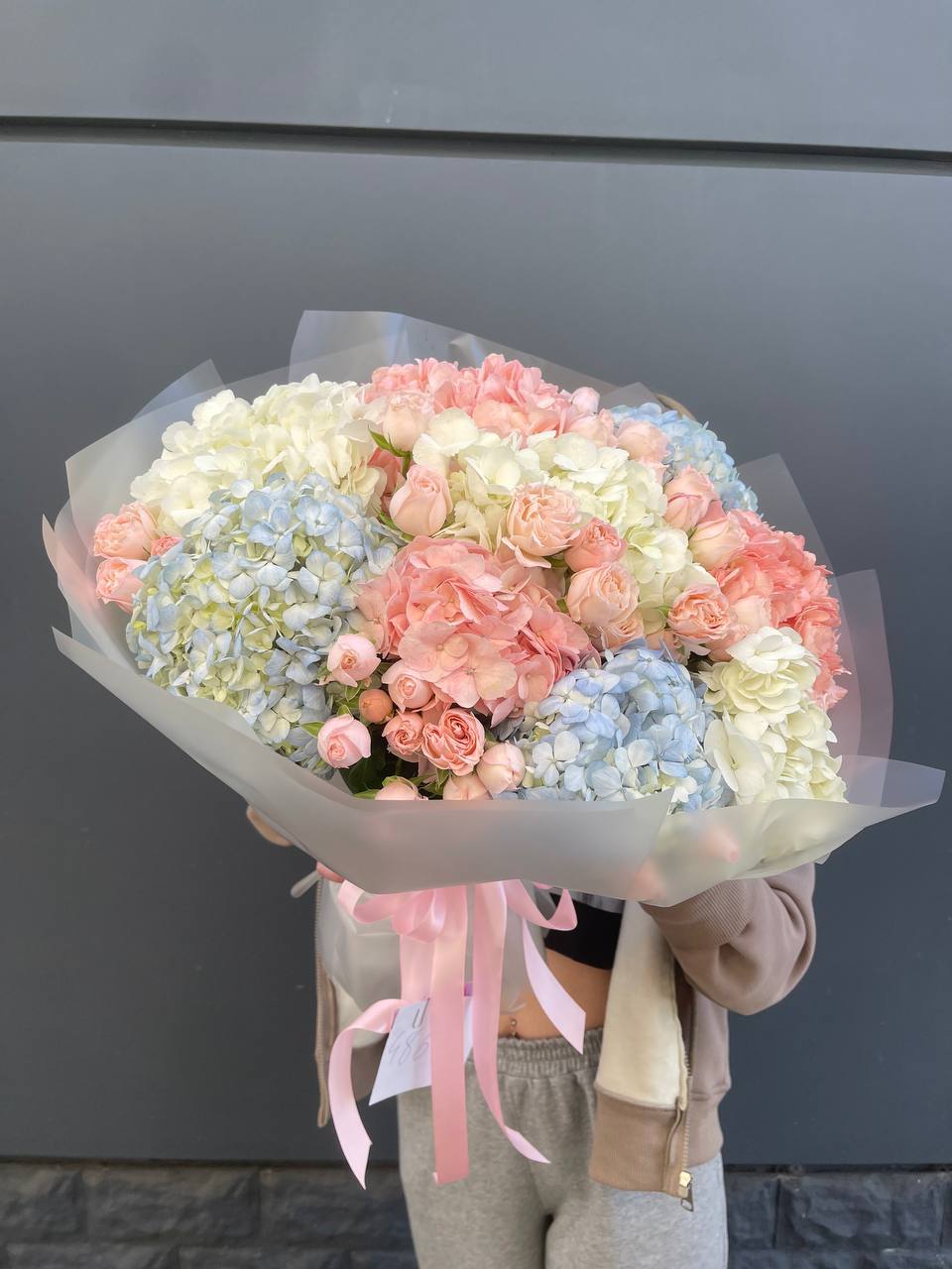 Гортензия и кустовые розы соединяются с веточками эвкалипта и ваксфлауэра в свободной композиции. Разная плотность соцветий создаёт живой ритм и природную лёгкость.