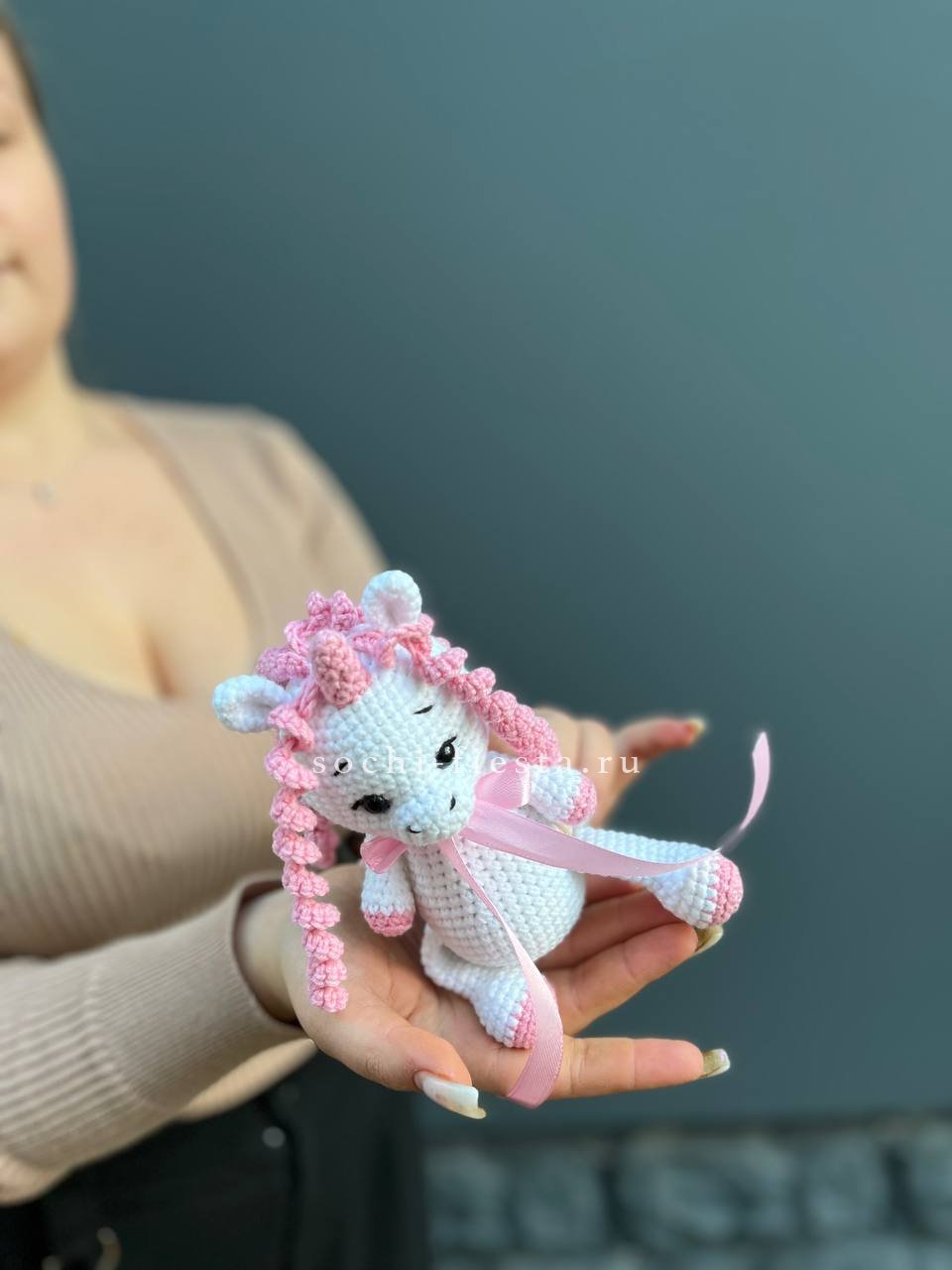 на фотографии единорог, ручное плетение. Доставка данной товарной единицы бесплатна при условии её заказа с цветами.