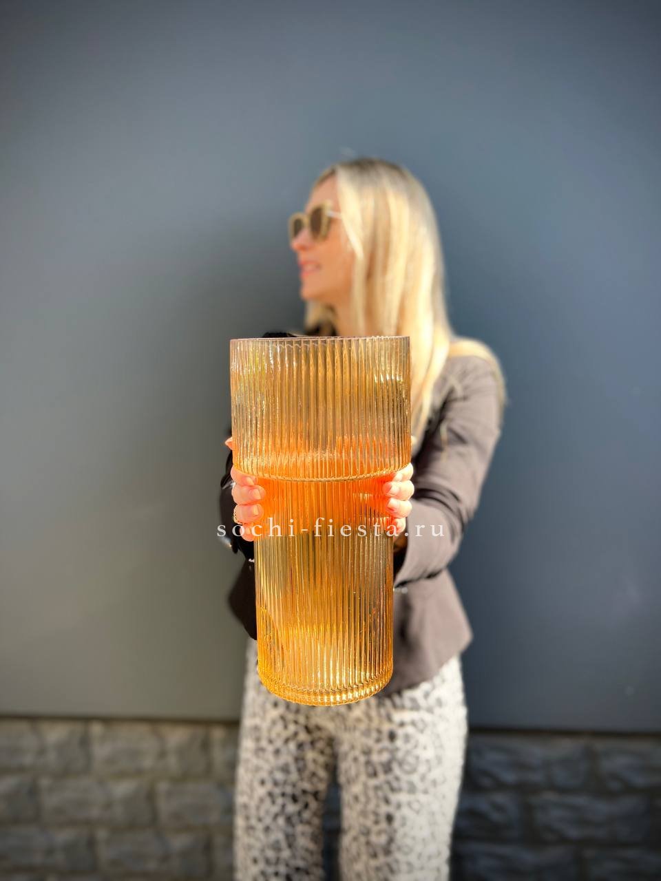 Рельефная поверхность создает игру света и визуальную глубину. Золотистое стекло меняет восприятие букета и работает как самостоятельный декоративный объект. Подходит для живых цветов и сухоцветов.