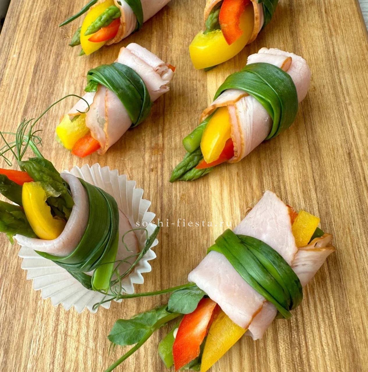 конвертики с овощами и ветчиной- 5 шт. Мини тосты с лососем, редисом и лимоном- 5 шт. Тарталетки с рийетом из лосося- 5 шт. Яйцо в пикантной начинкой из сыра- 5 шт.
