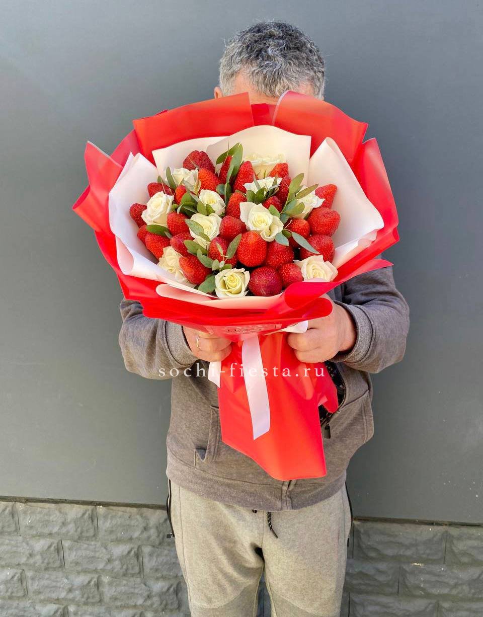 Кустовая роза окружает сочную клубнику, а эвкалипт добавляет свежести всей композиции. Букет упакован в дизайнерскую бумагу и перевязан лентой для аккуратной формы.