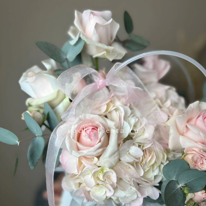 Коробка — плотный картон с матовой поверхностью. Внутри — флористическая губка (оазис), пропитанная водой. Сверху — атласная или шёлковая лента, декоративная тесьма.