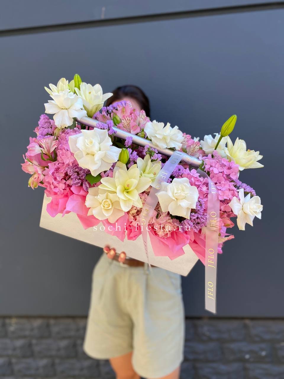 Лилии задают вертикальный ритм композиции, а французские розы и гортензия заполняют объем мягкими переходами формы. Альстромерия и статица добавляют графичности общему силуэту.