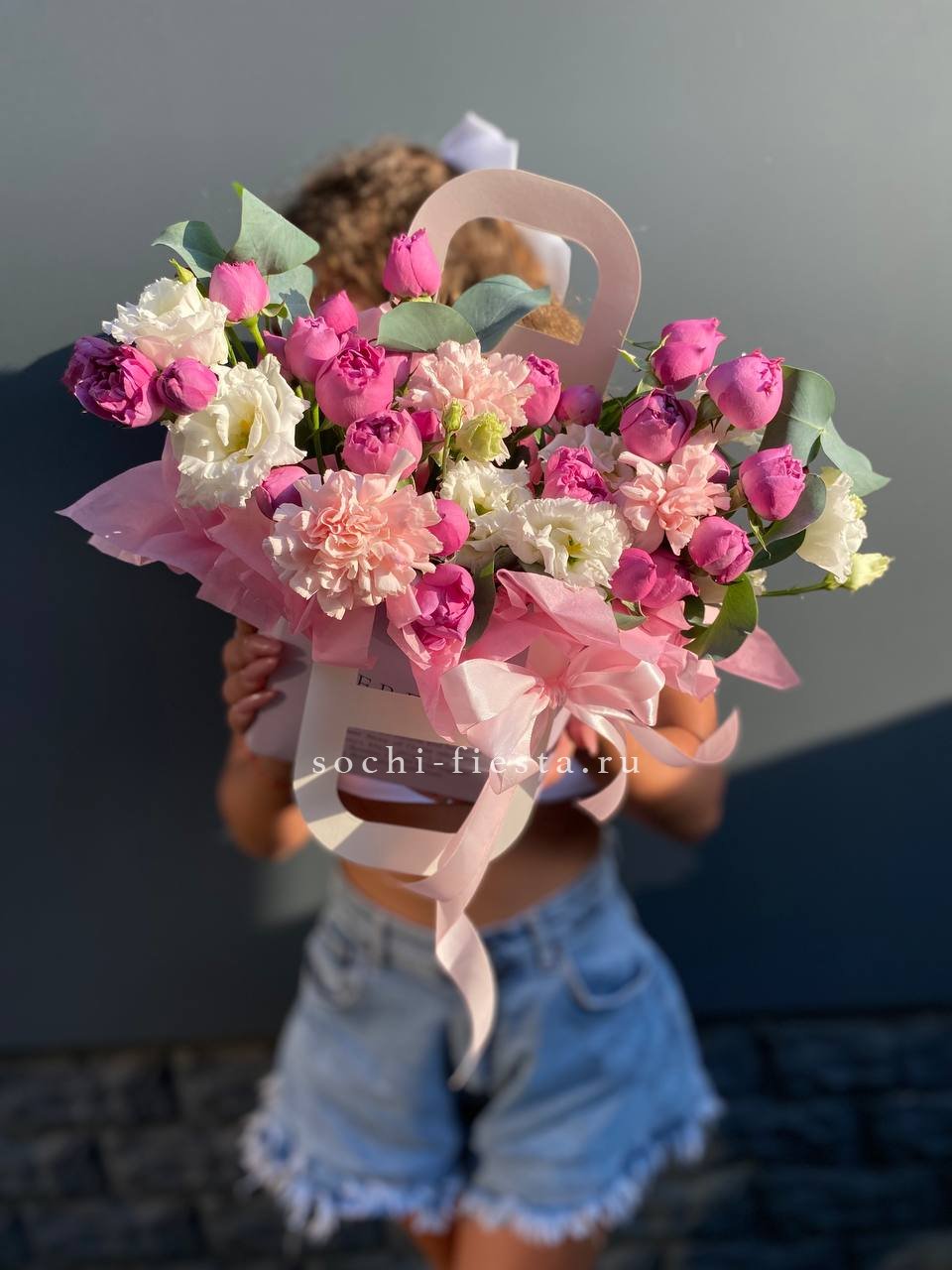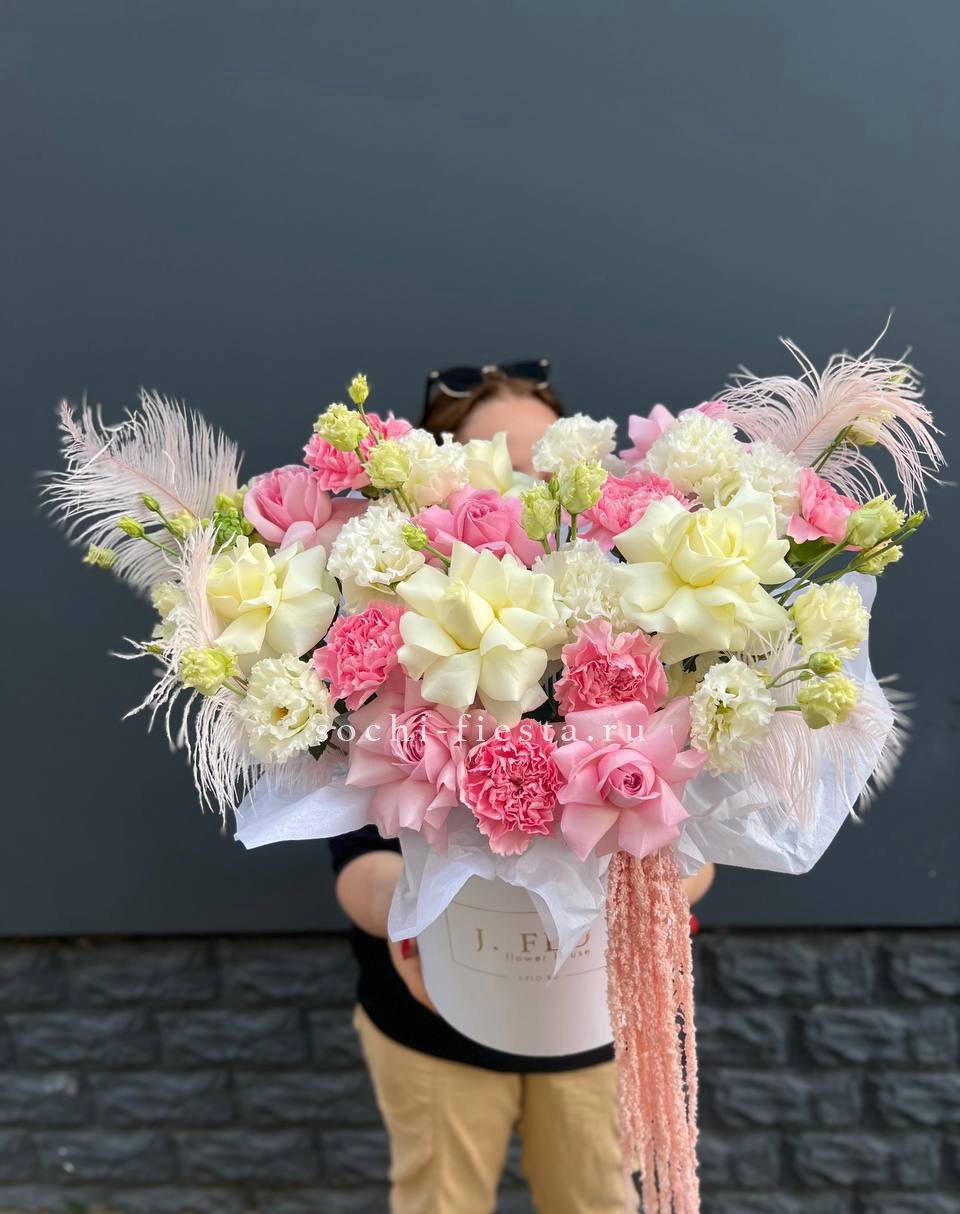 Белый цилиндр вмещает кустовые розы, эустому и диантусы с плотной текстурой бутонов. Эвкалипт задаёт вертикальный ритм, а пять макаронс поддерживают чистоту цветовой гаммы.