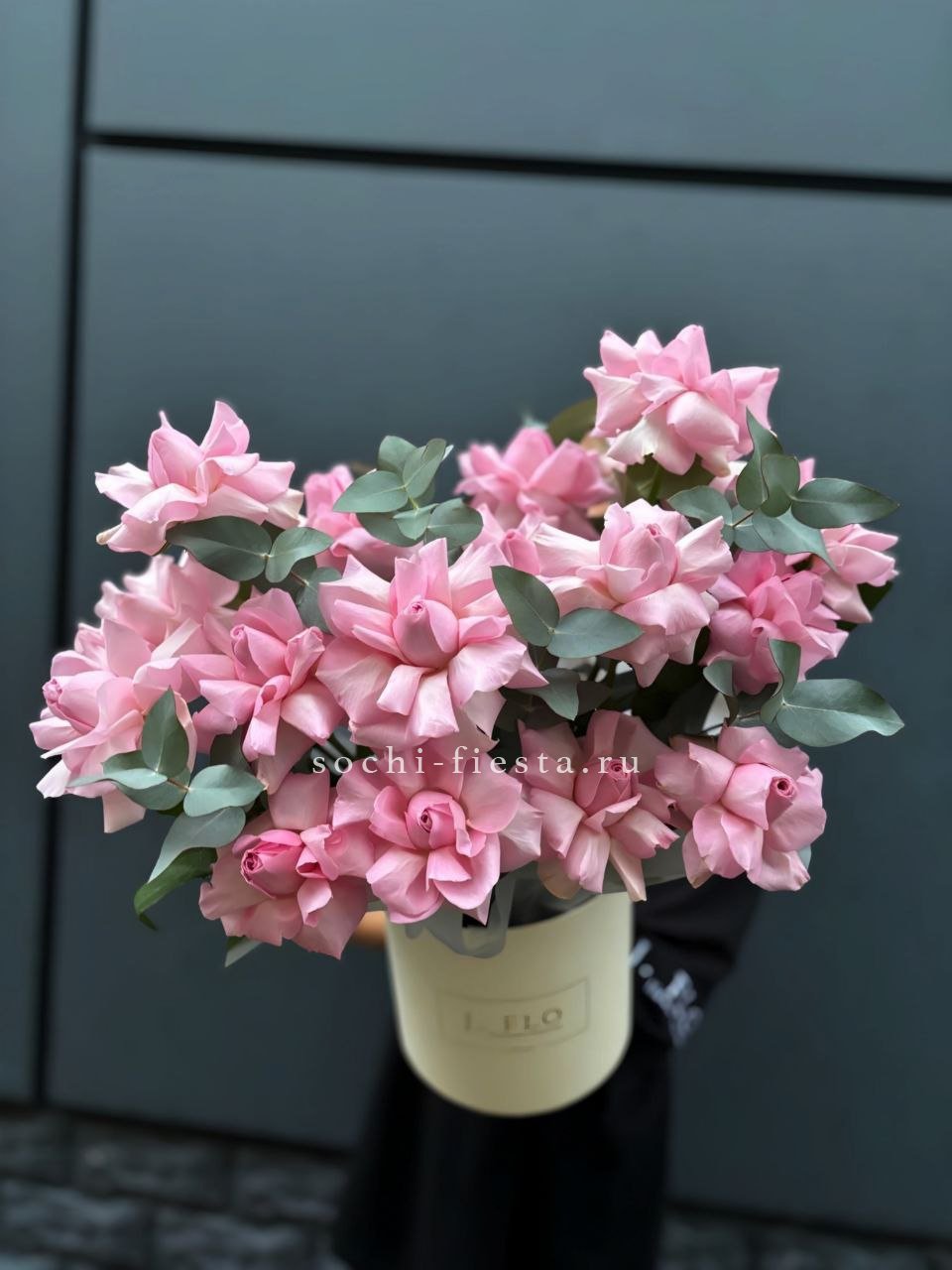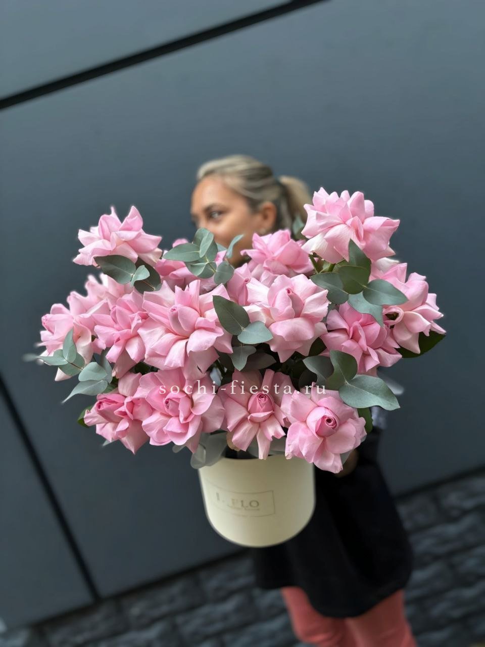 роза кустовая, эустома, диантус,  эвкалипт, 5 макаронс, белый цилиндр D15 Цвет коробки может быть согласован с клиентом.  Наполнение может меняться по наличию.