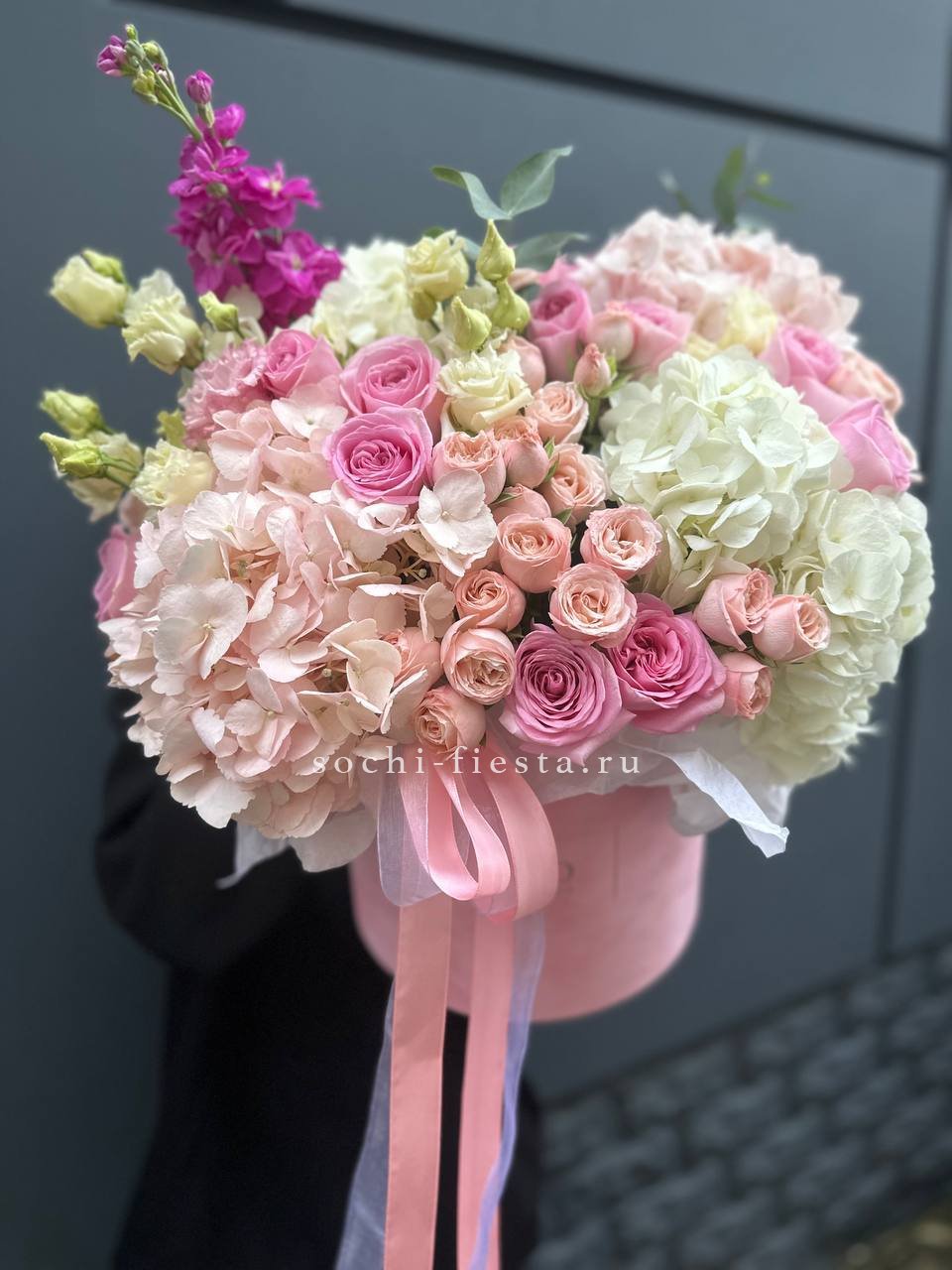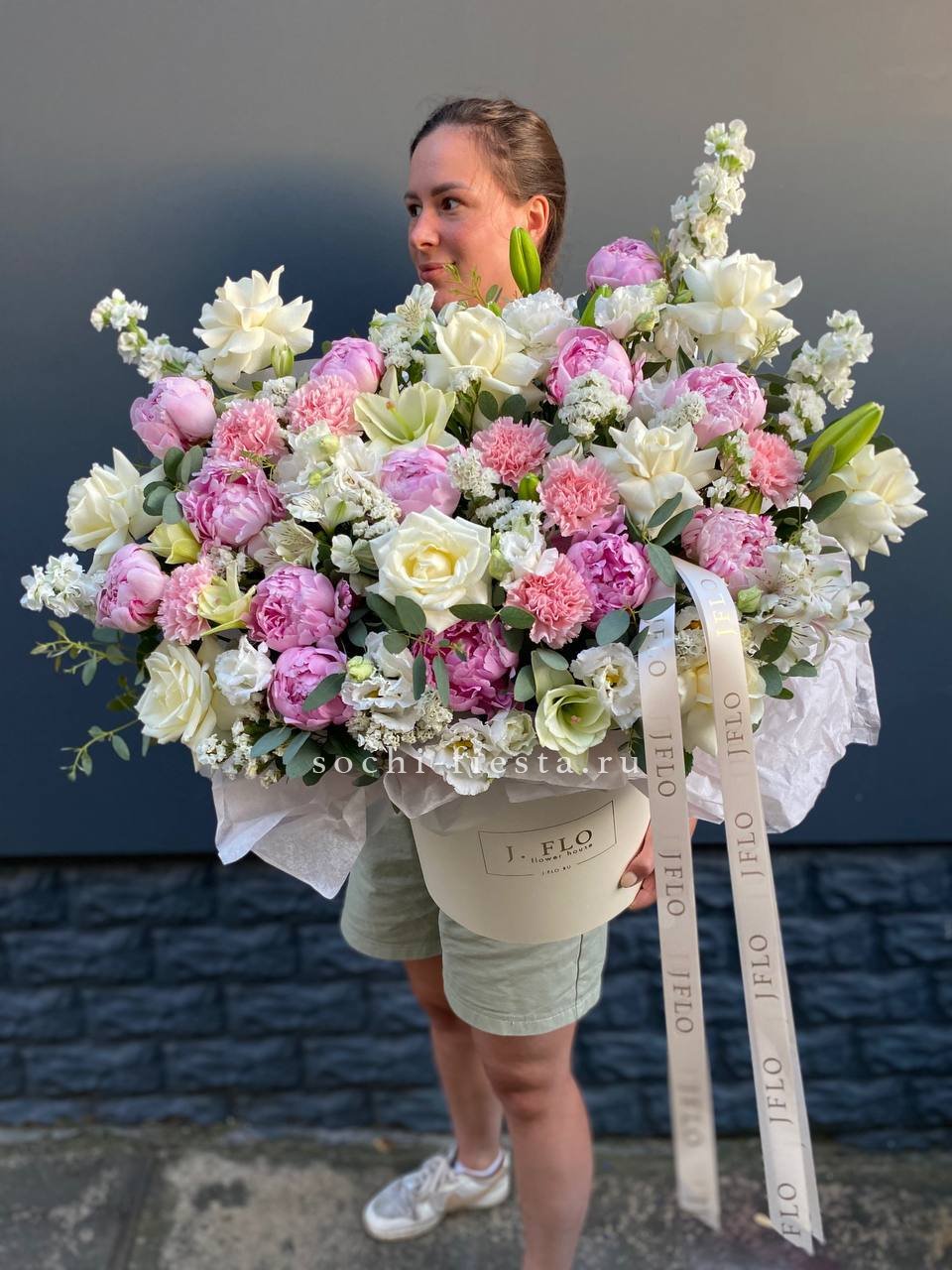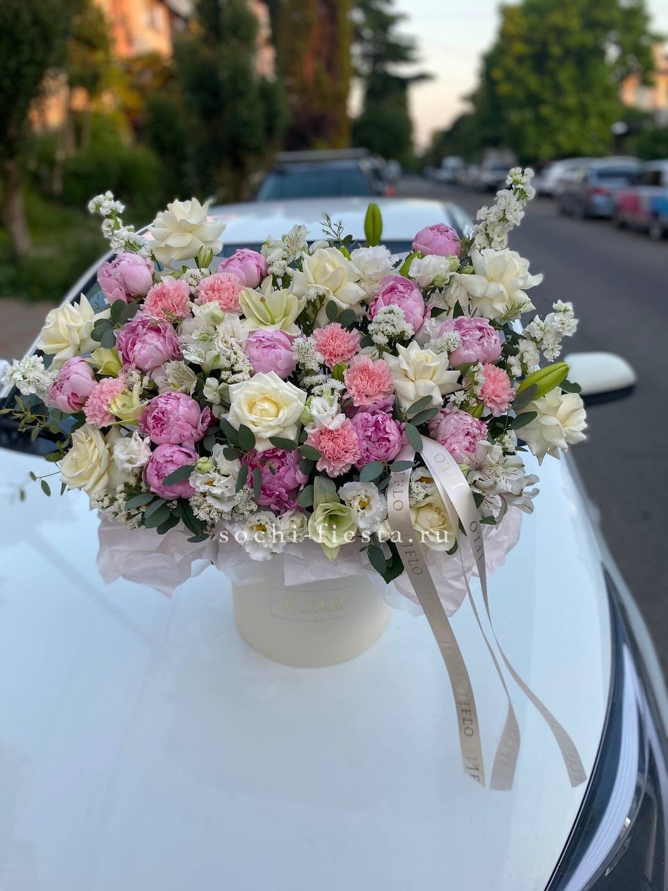 Пышная композиция в круглой коробке сочетает бутоны роз и диантусы со сладким дополнением из одиннадцати макаронс. Светлая гамма и плотное наполнение создают объемное присутствие в интерьере. Формат для тех случаев когда хочется впечатлить.