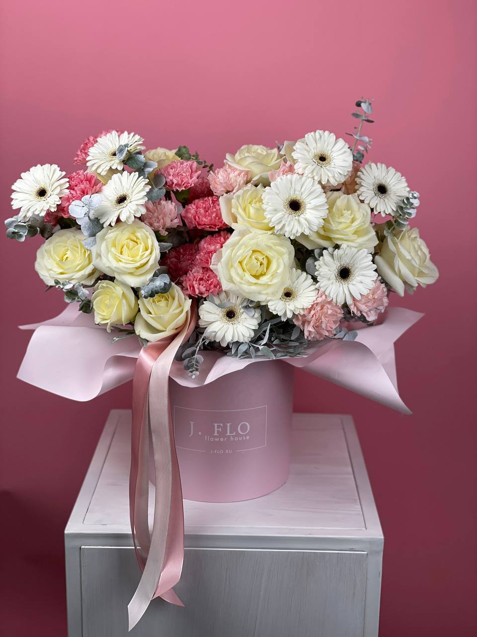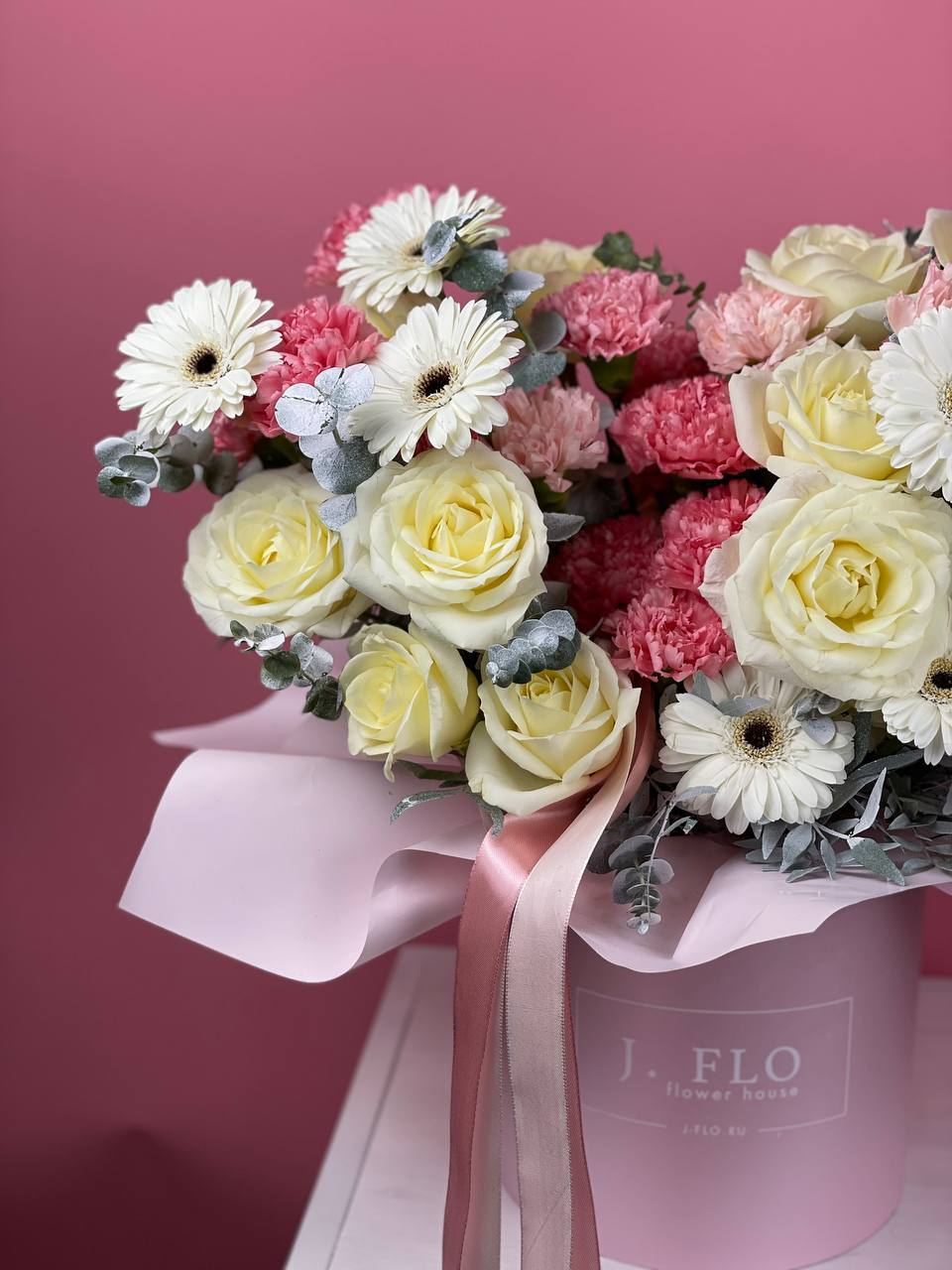 комбинация цветочных элементов нежных оттенков, включая розы и диантусы, круглая коробка D20, 11 макаронс.