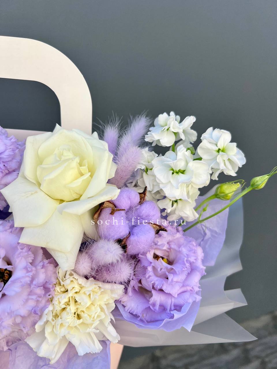 эустома, маттиола, белые розы, хлопок, лента, сумка-кашпо.