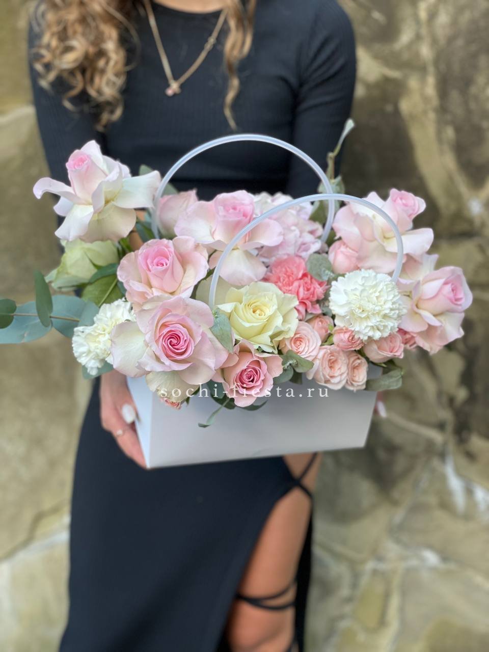 Гортензия заполняет пространство пышными соцветиями, розы и эустома расставляют акценты. Диантус и эвкалипт дополняют картину зеленью и мелкими деталями. Компактная форма удобна для размещения.