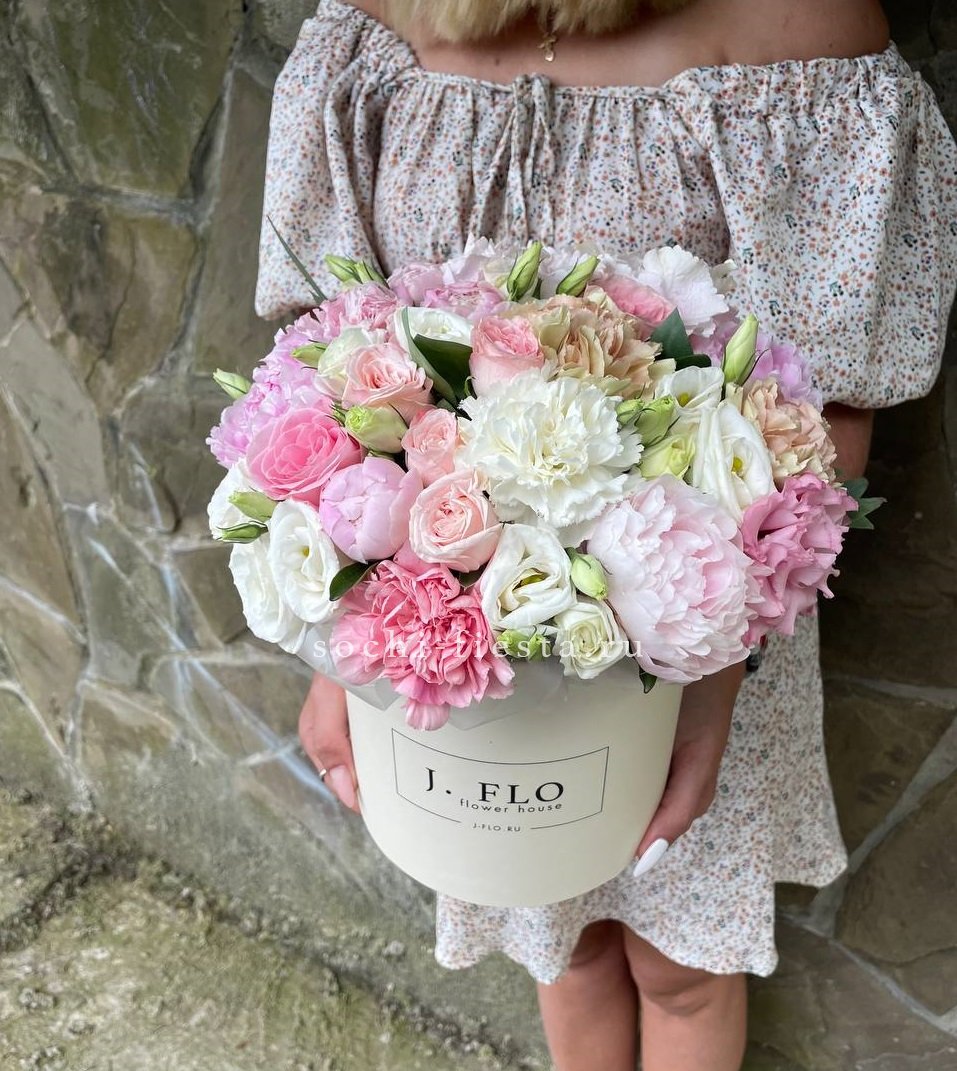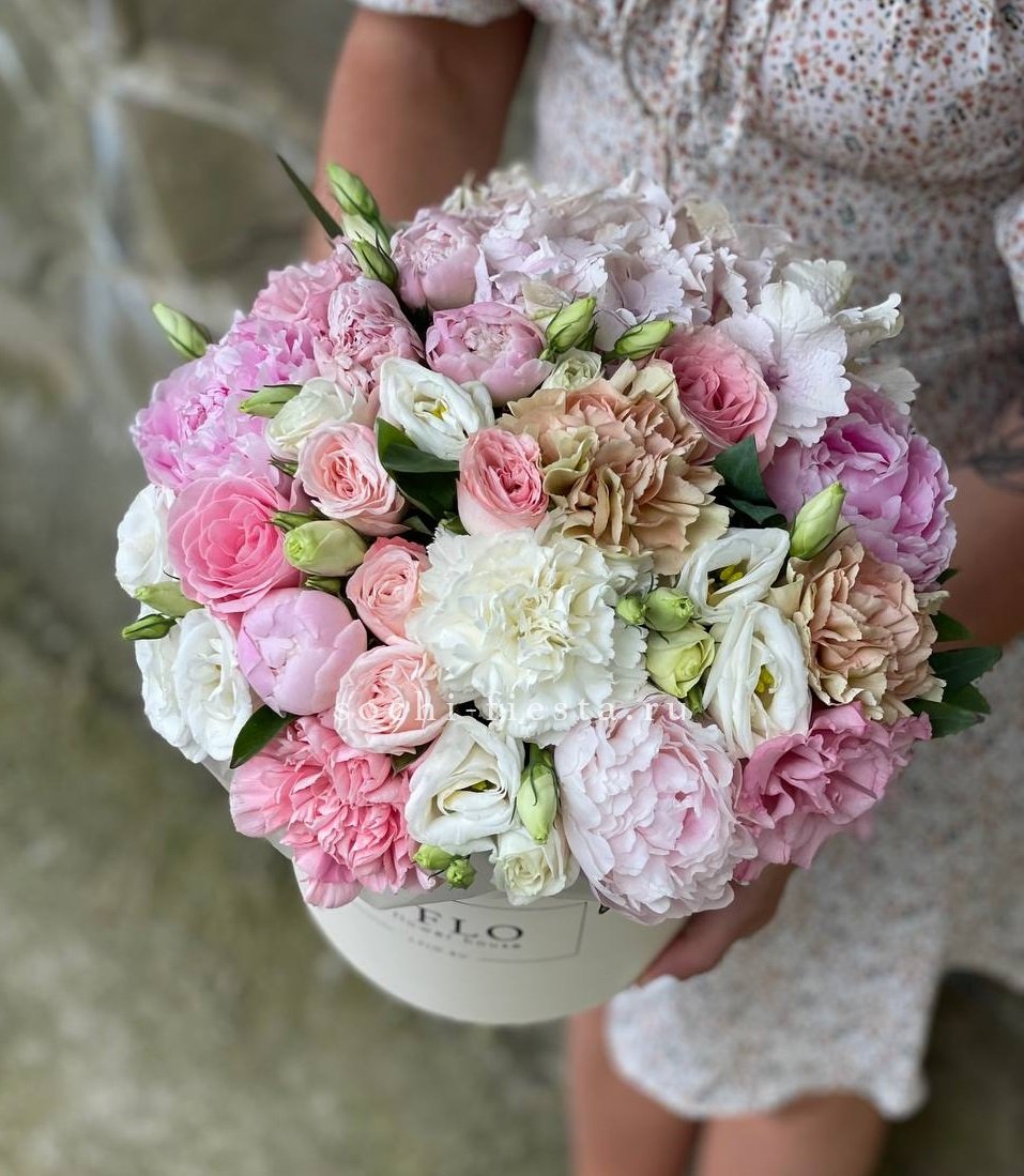 нежная композиция на базе оазиса с применением одноголовых роз, эустомы, гортензии, диантусов, эвкалипта, упаковки.