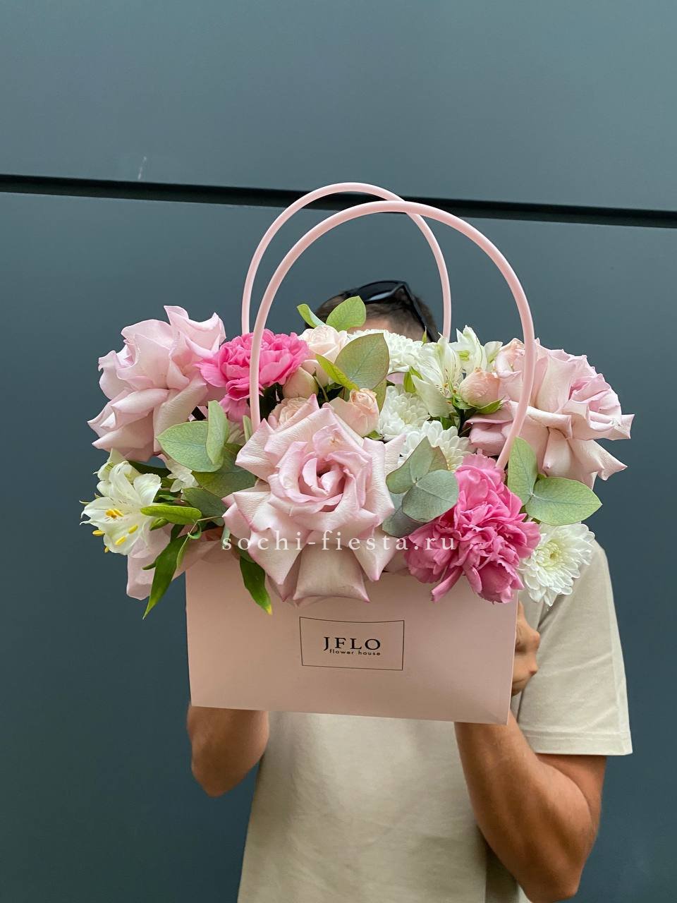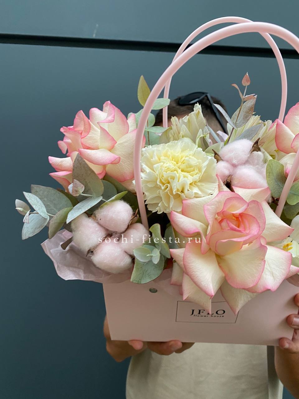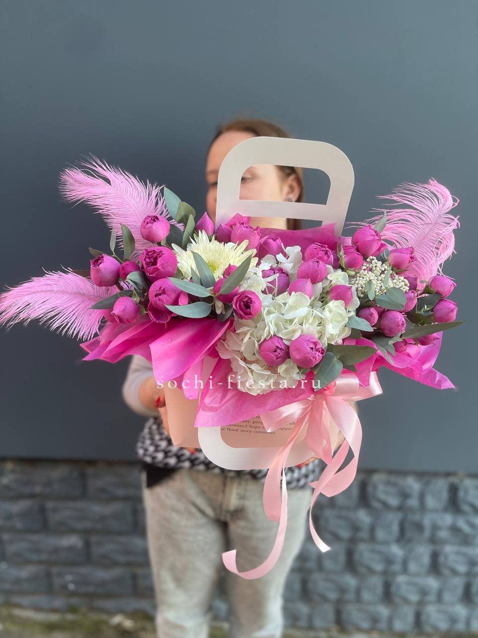 гортензия, розовые розы, эустома, диантусы,эвкалипт, лента, сумка-кашпо.