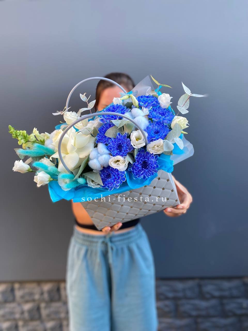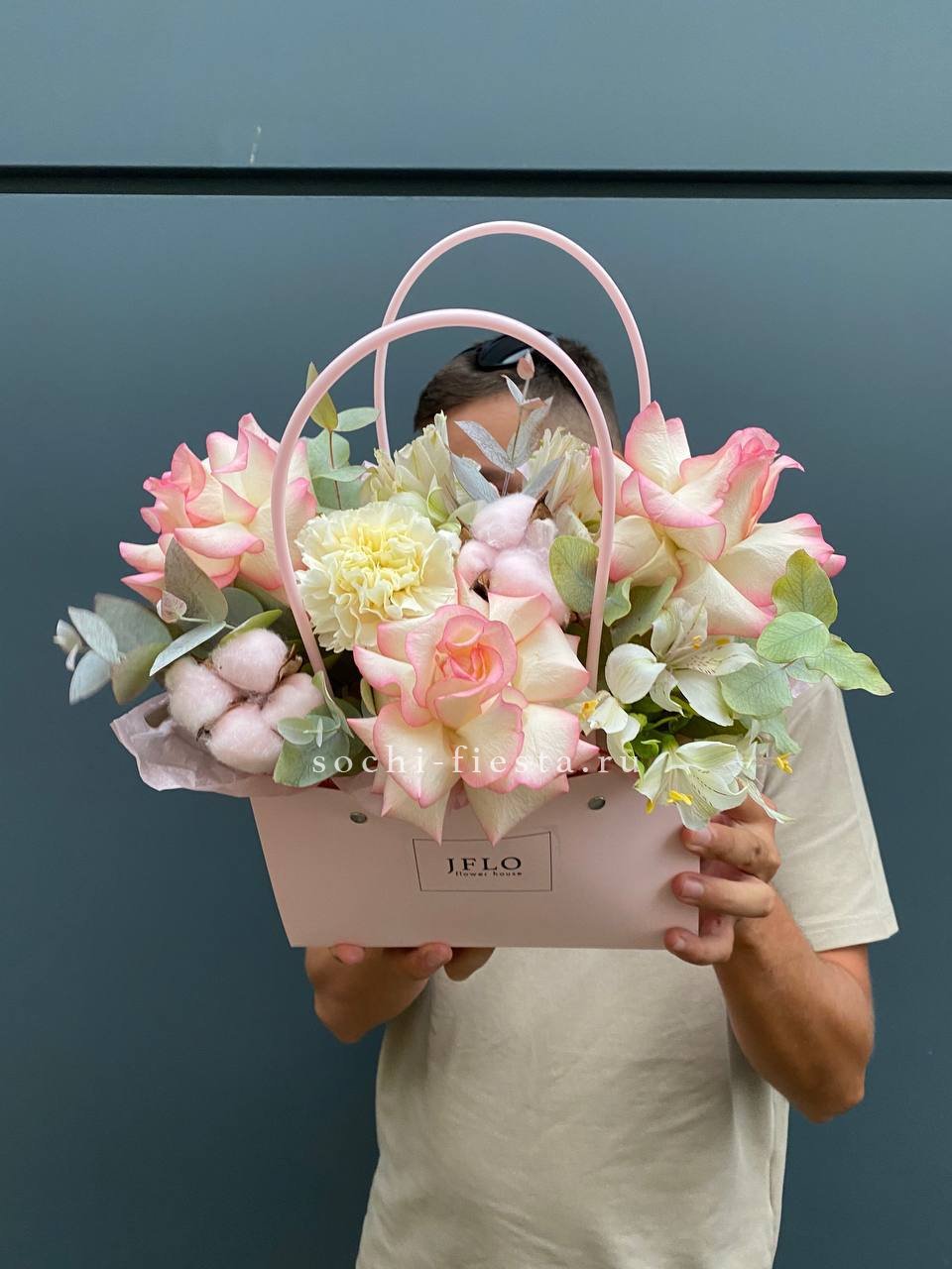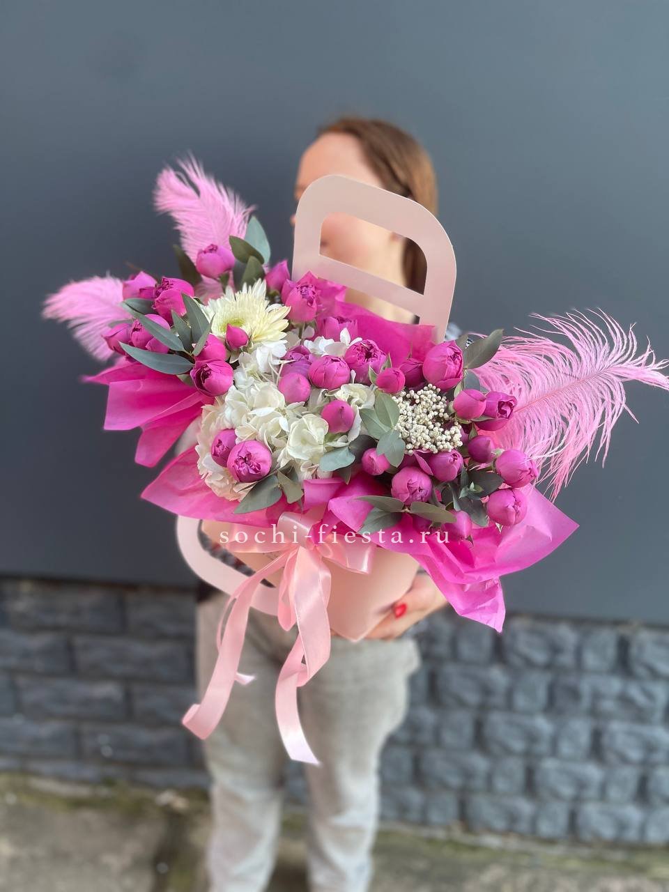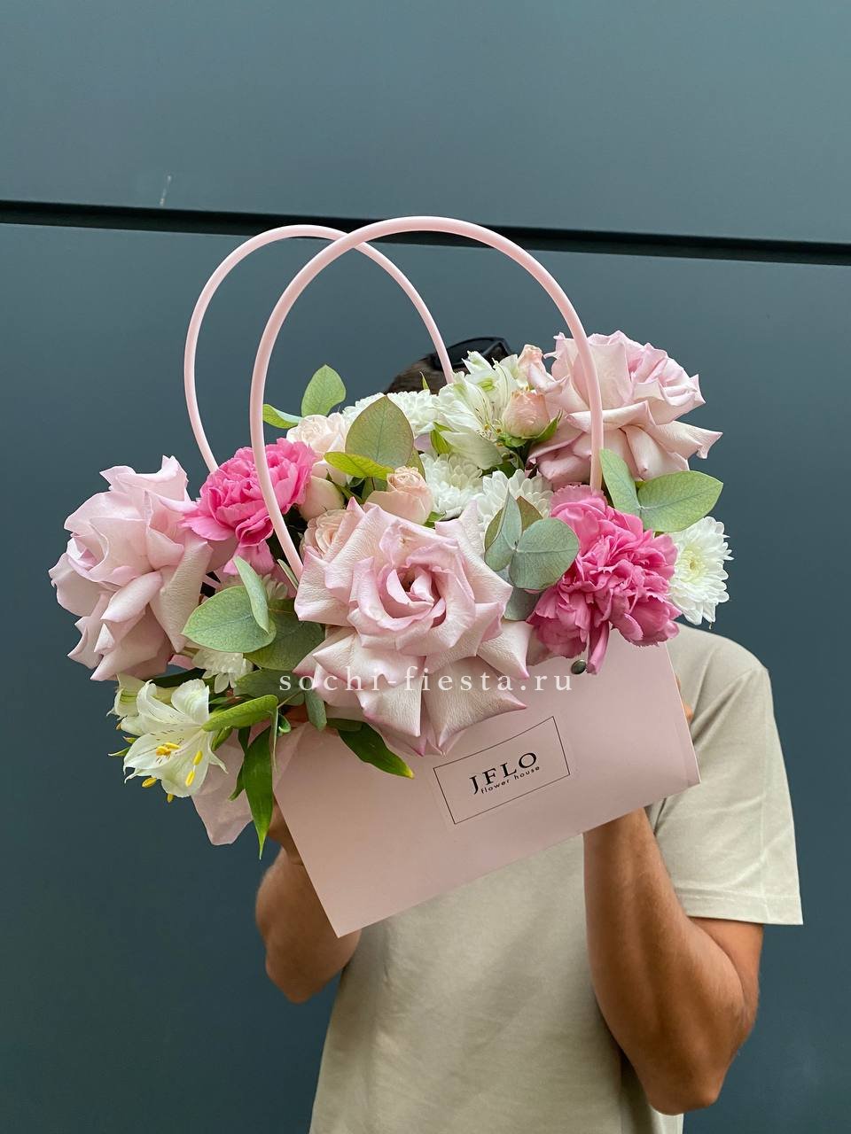гортензия, розовые розы, эустома, диантусы,эвкалипт, лента, сумка-кашпо.