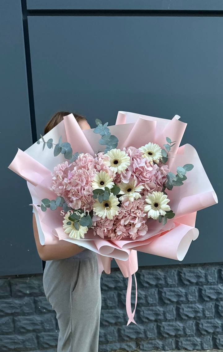 Этот букет создан, чтобы заряжать позитивом! Яркие акценты розовых гербер и теплые оттенки кремовых роз, в обрамлении свежей зелени, создают ощущение солнечного дня и беззаботного счастья. Это не просто цветы, а концентрат радости, который мгновенно поднимет настроение и добавит ярких красок в жизнь.