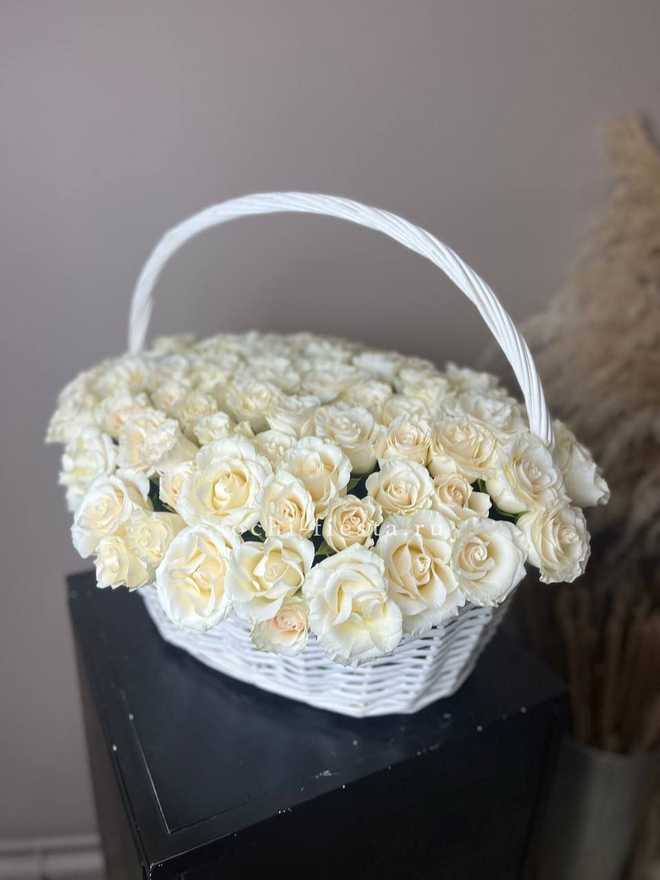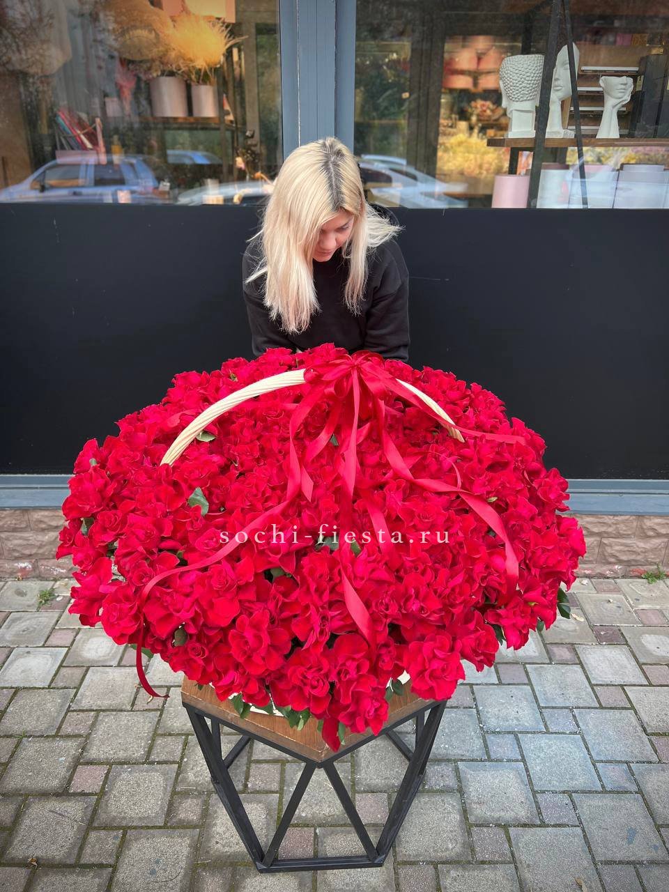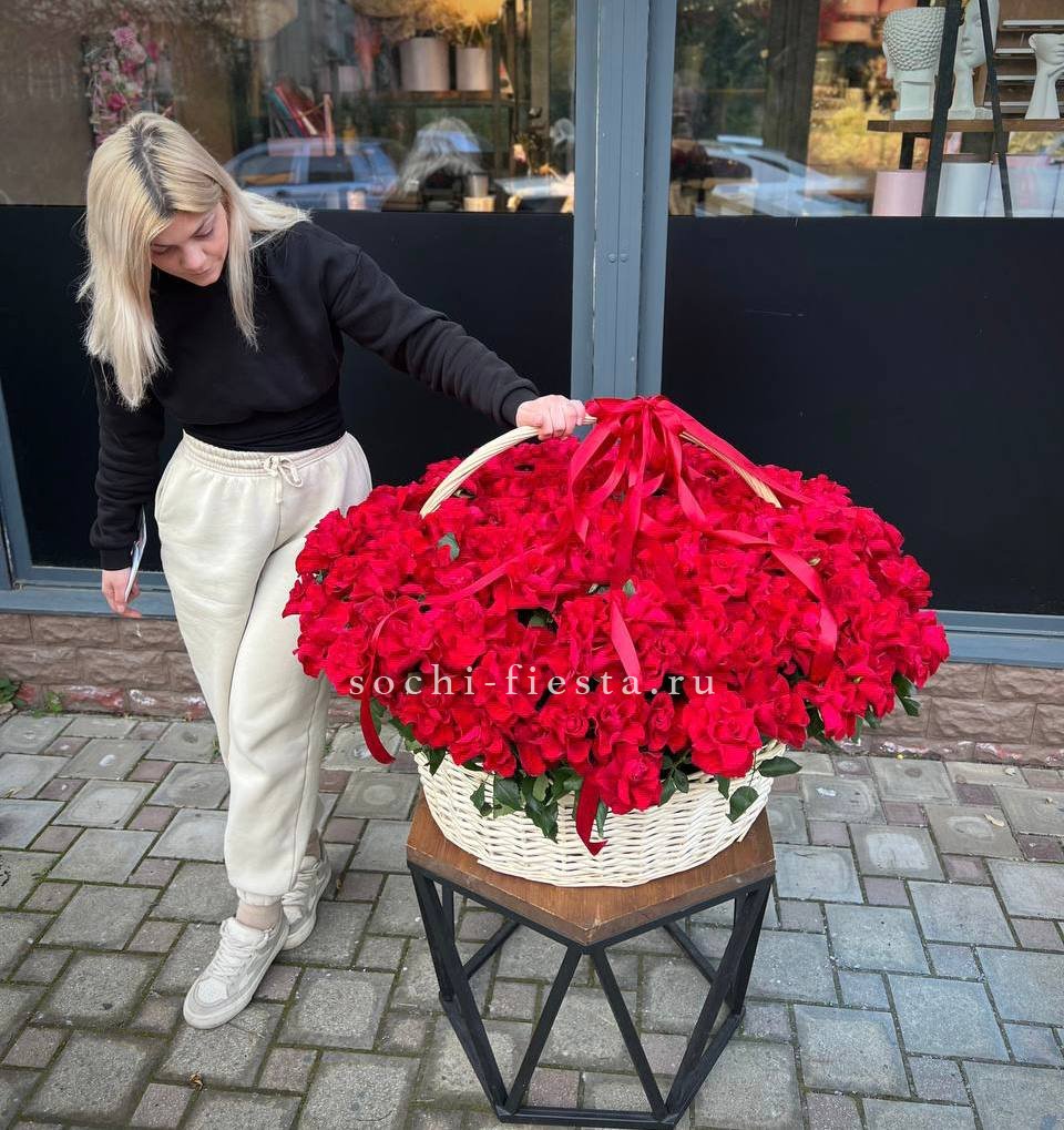Пятьсот пять алых бутонов собраны в масштабную корзину, которая заполняет пространство цветом и объемом. Это композиция, которая говорит сама за себя своим количеством и насыщенностью.