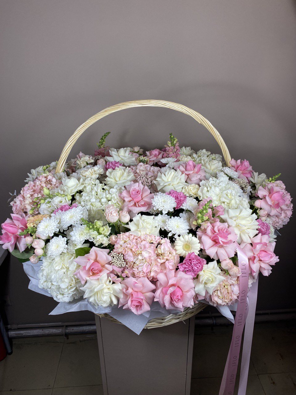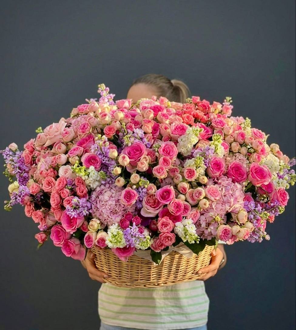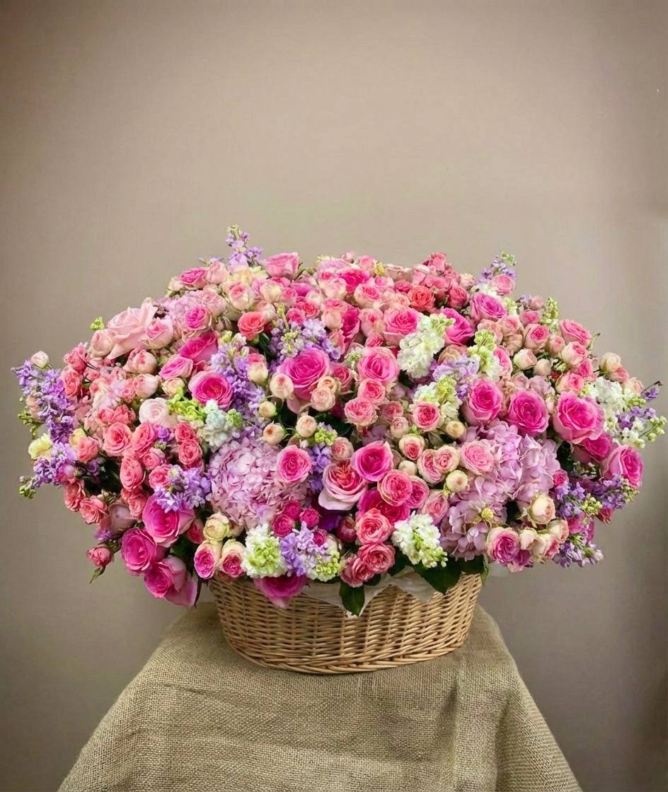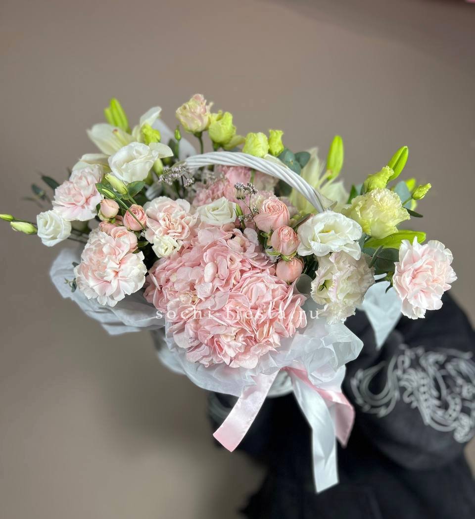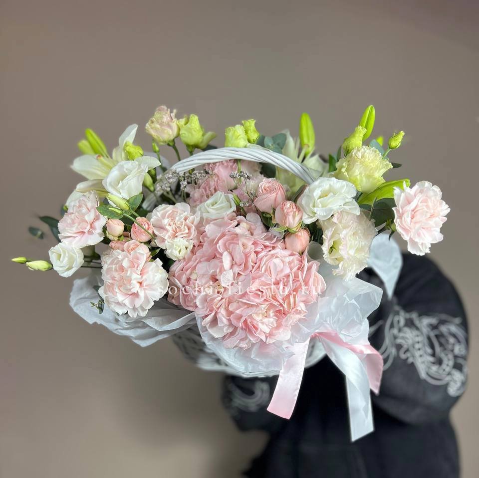 Восемь видов цветов складываются в harmonичную композицию со светлой корзиной в основе. Диантусы и эустома перекликаются с розами, а гортензия задает мягкий объем всей структуре.
