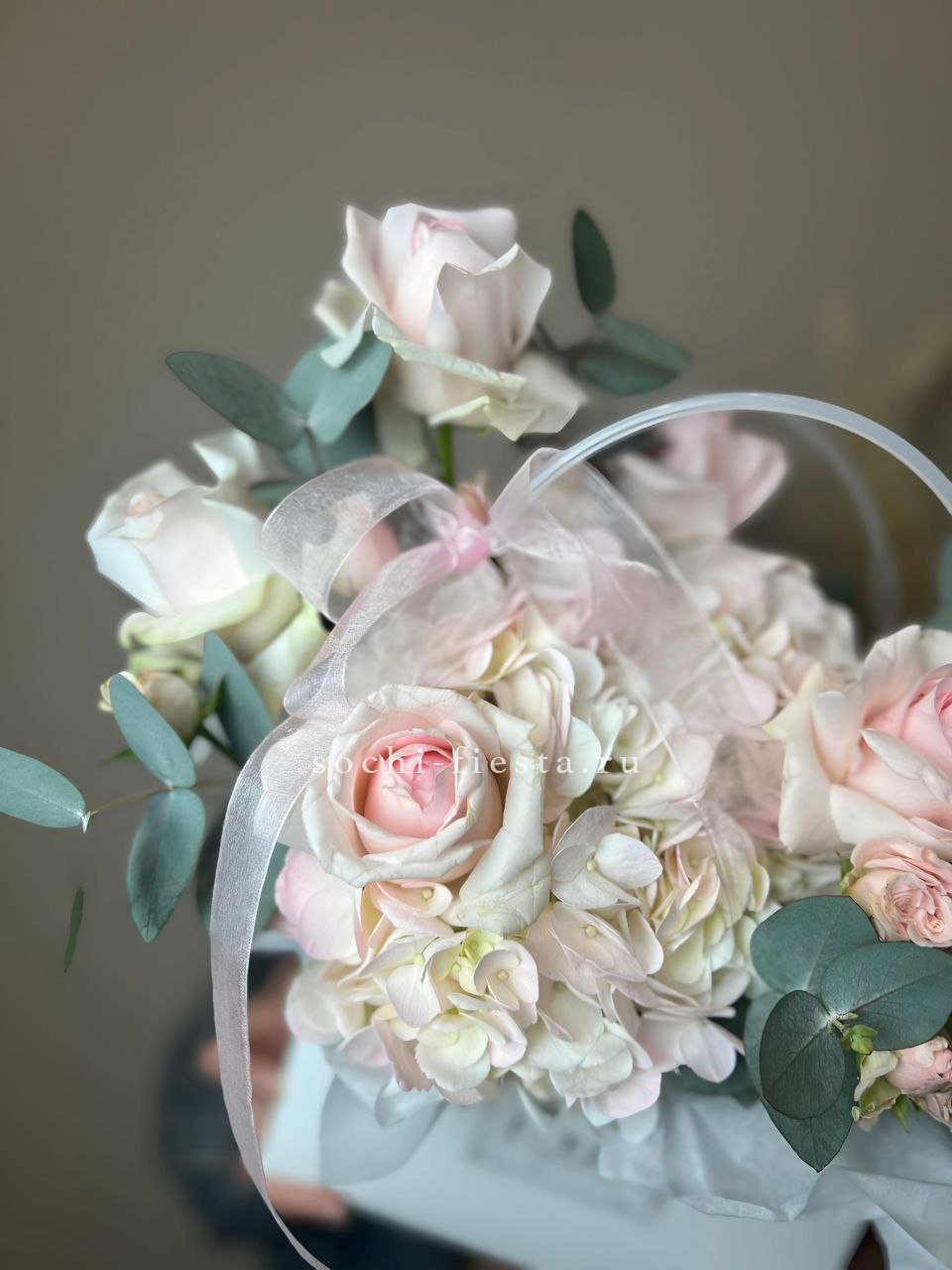 розы кустовые, диантусы, эустома, лента, корзина D35.