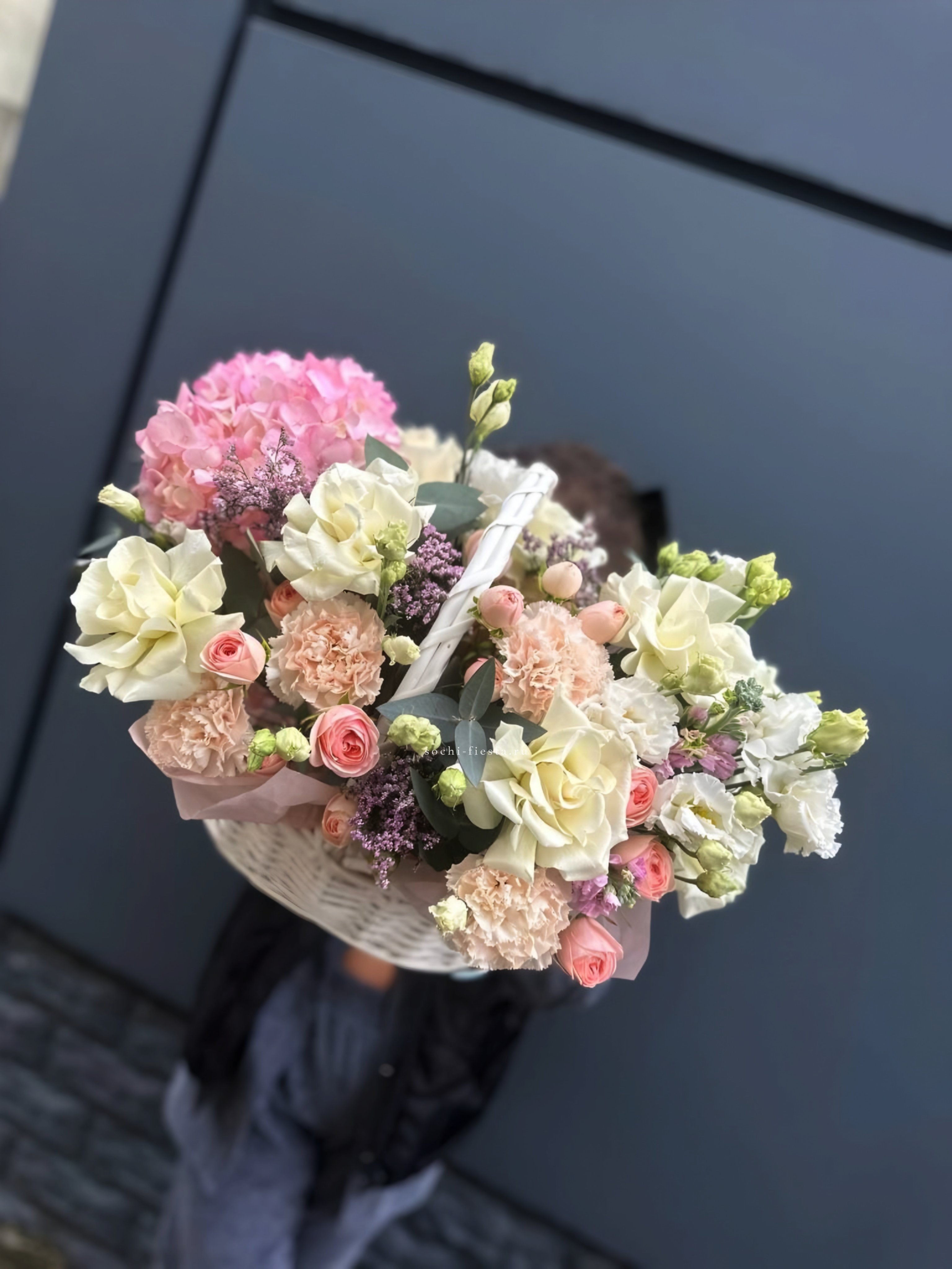 Двадцать пять французских роз в корзине создают плавный переход от светлых розовых тонов к насыщенной фуксии. Эвкалипт добавляет свежести и завершает композицию естественной зеленью. Букет удобно разместить на столе или комоде благодаря устойчивой корзине.