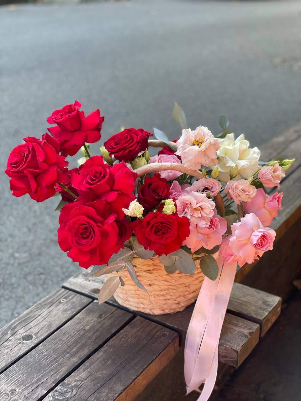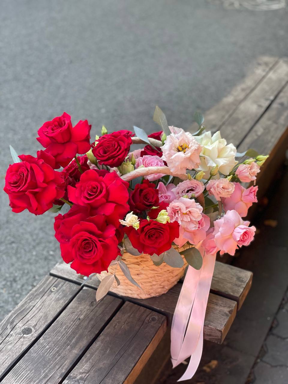 Плотная сферическая форма из пышных бутонов создаёт объёмную композицию в плетёной корзине. Ветки эвкалипта добавляют воздушности между головками цветов. Классическое решение для яркого события или знакового дня в жизни близкого человека.