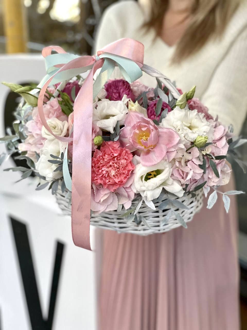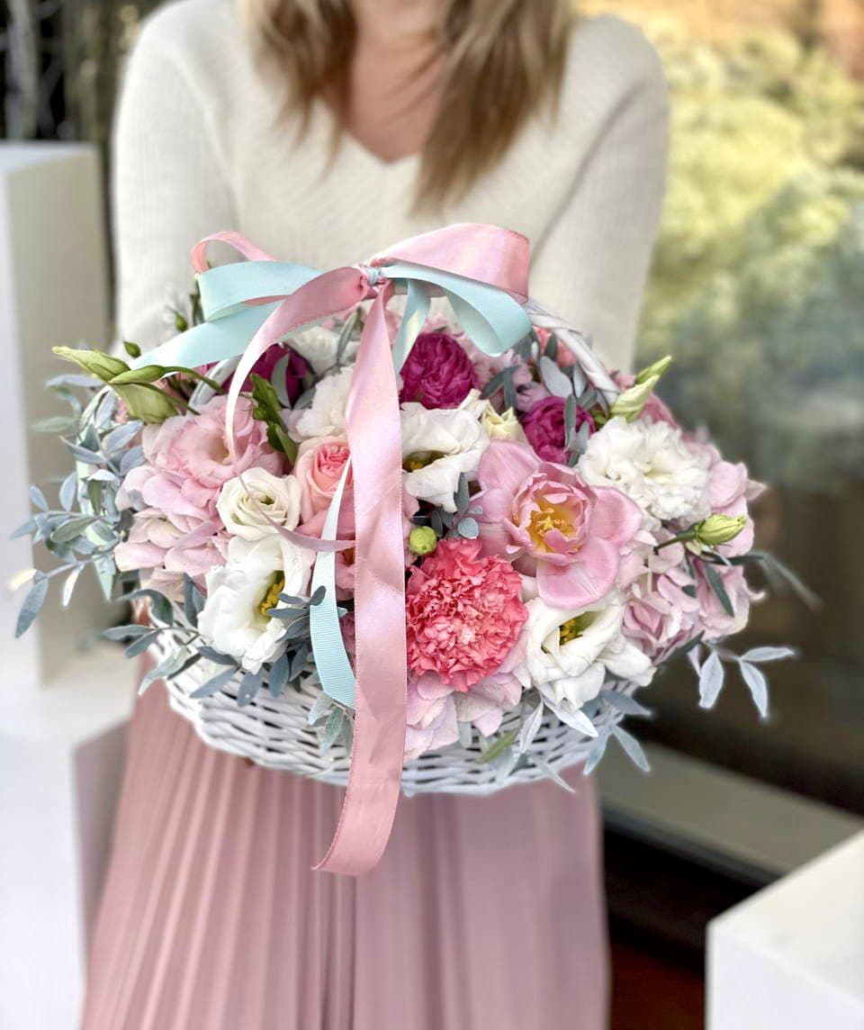Воздушные соцветия эустомы собраны в округлую композицию с мягким переходом пастельных тонов. Светлая корзина создает легкую базу для объемной цветочной шапки.