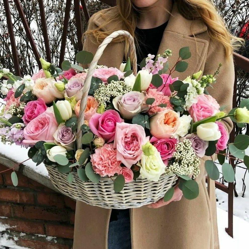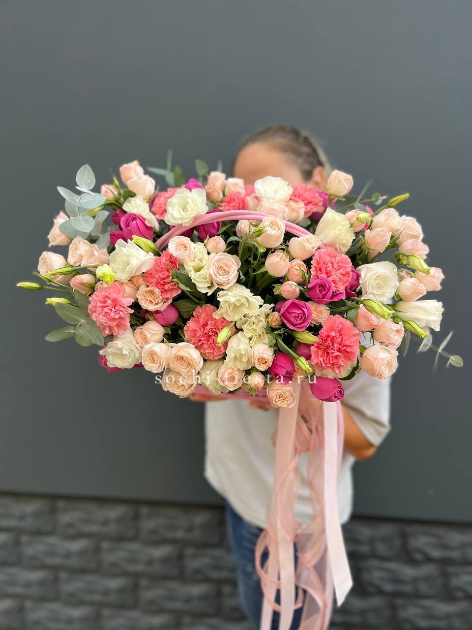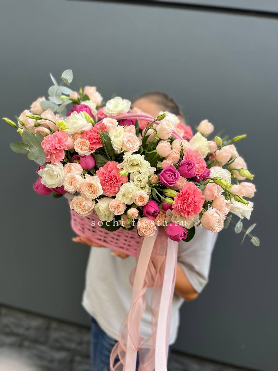 Плетеная корзина вмещает густую композицию из лилий с добавлением эвкалипта. Объемная форма создает впечатление цветущего сада, собранного в одном месте.