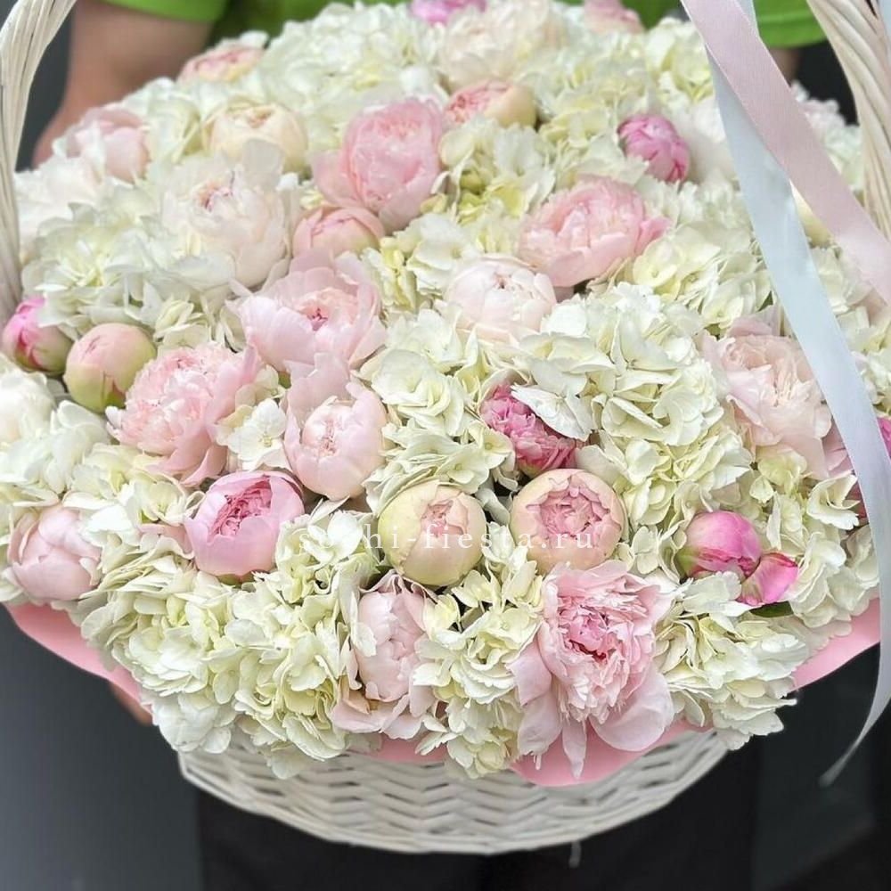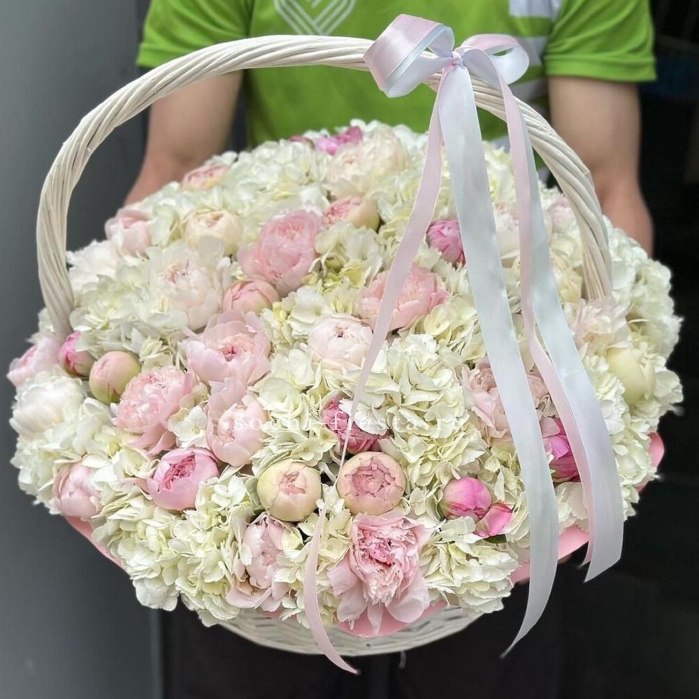 Воздушные шапки гортензий обрамляют пышные бутоны пионов в светлой корзине. Композиция выглядит объемно и легко заполняет пространство своим присутствием. Природная гармония без лишних деталей.