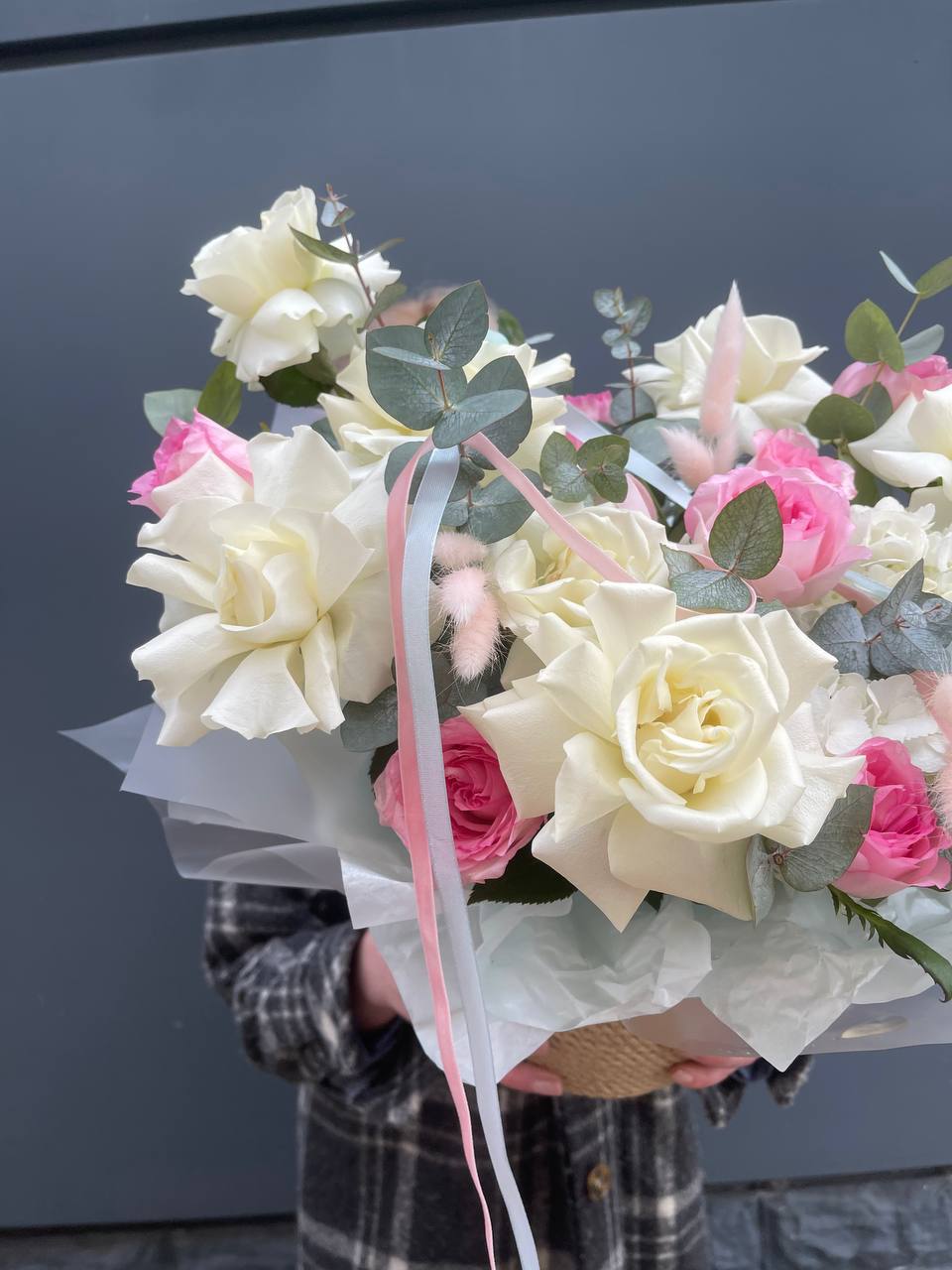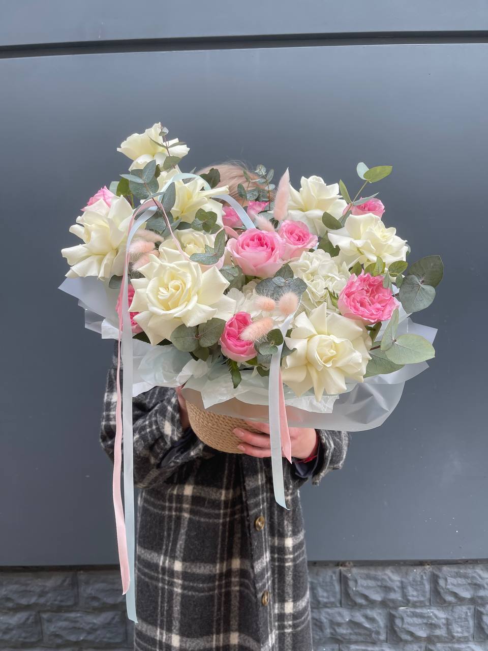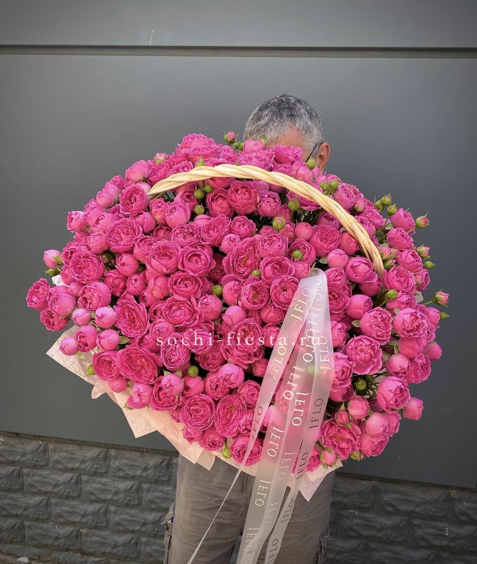Монументальная композиция из полутора сотен белоснежных бутонов создает впечатление цветочного облака. Корзина придает устойчивость и завершенность форме, позволяя разместить такой масштабный ансамбль в любом пространстве.