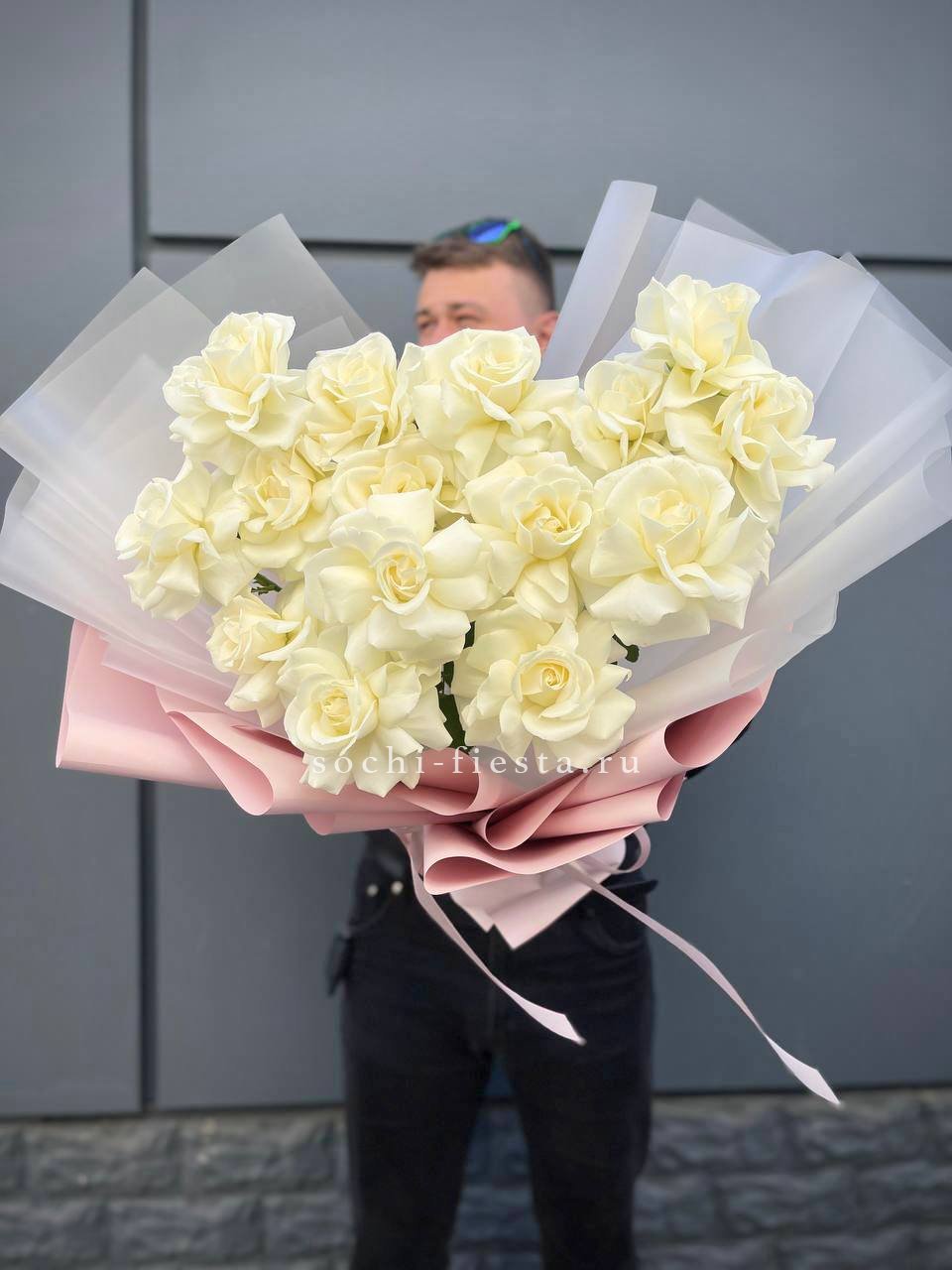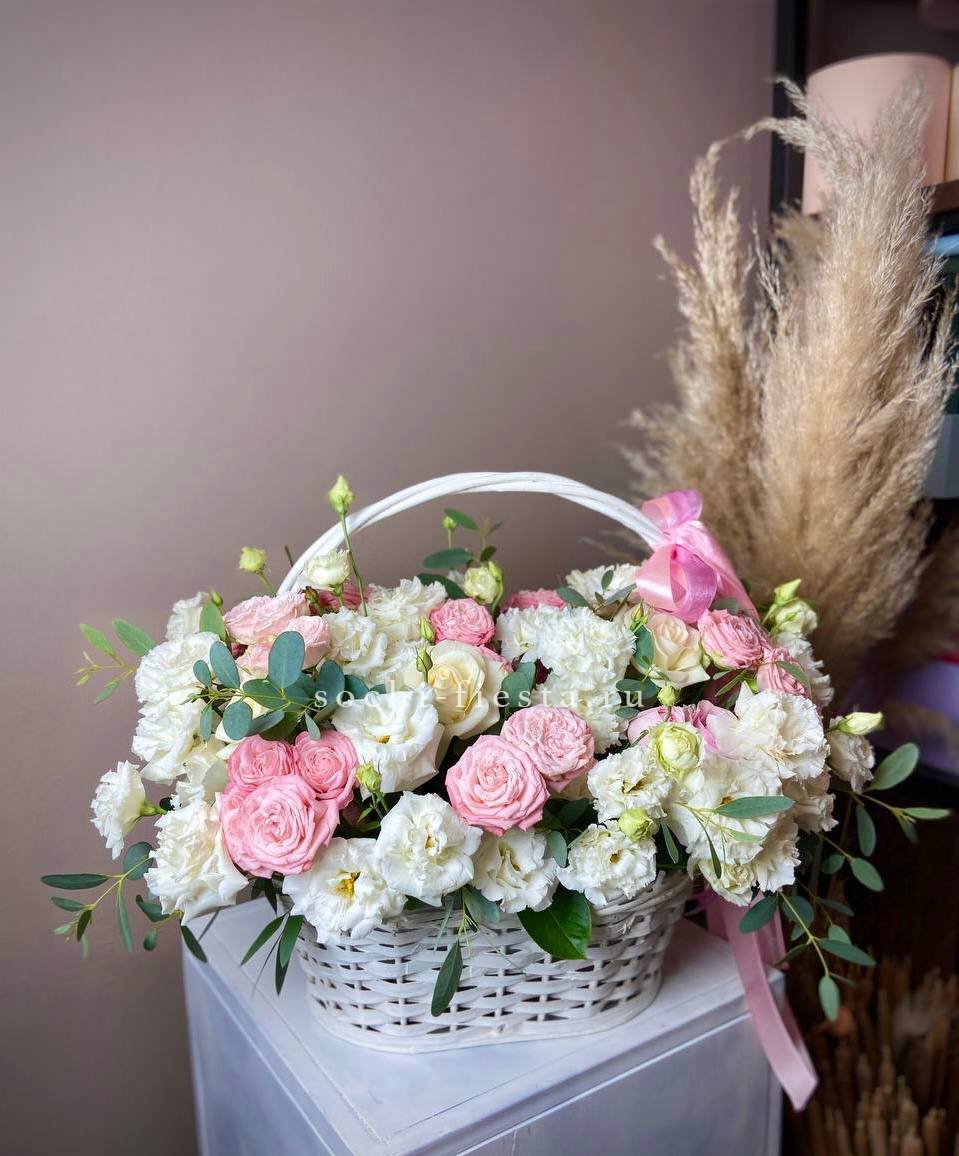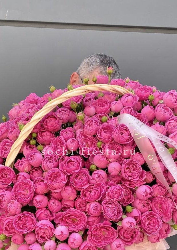 Монументальная композиция из полутора сотен белоснежных бутонов создает впечатление цветочного облака. Корзина придает устойчивость и завершенность форме, позволяя разместить такой масштабный ансамбль в любом пространстве.