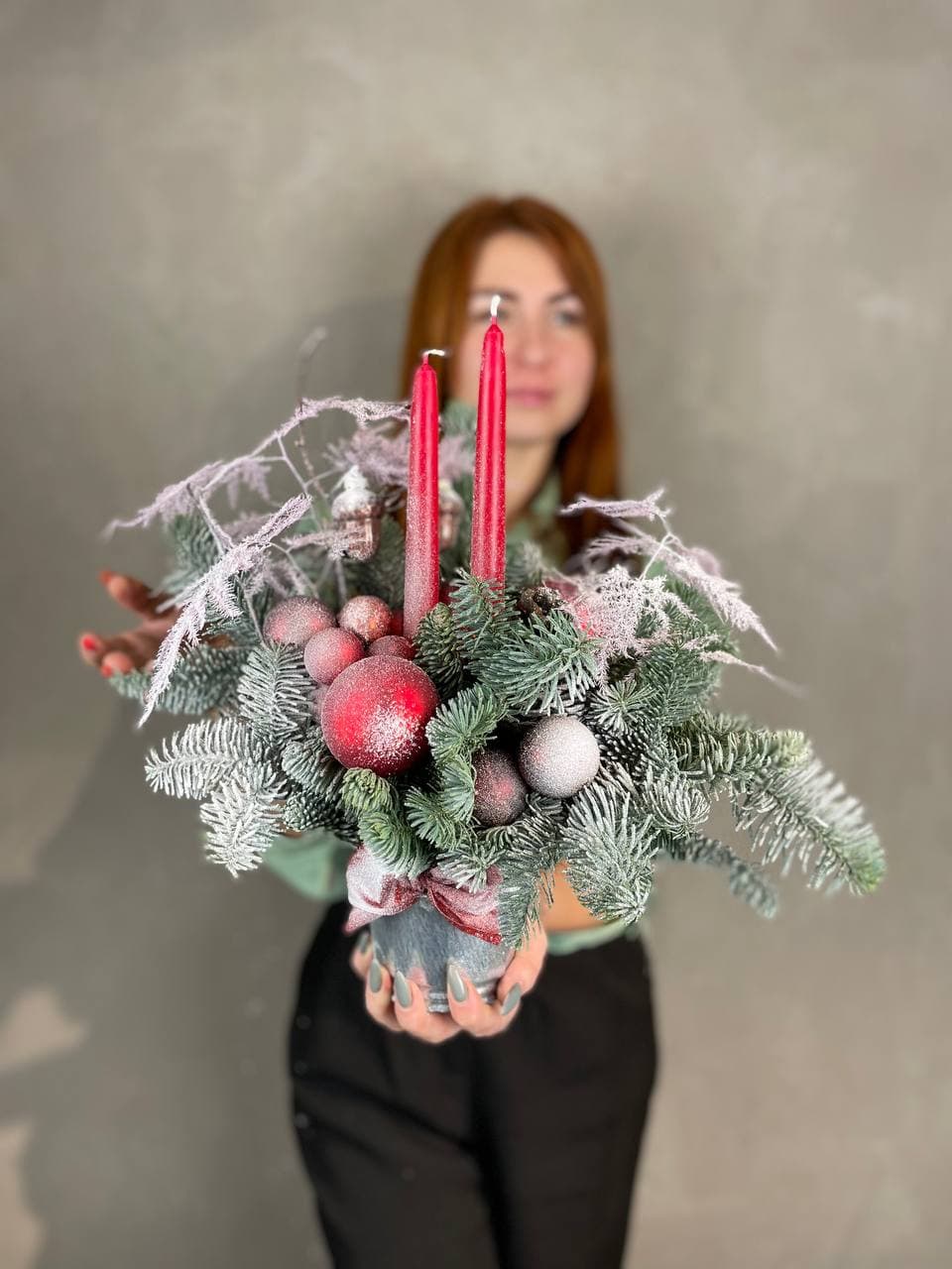 датский нобилис, кашпо, оазис, свечи, новогодние игрушки, декор Готовая композиция может иметь незначительные внешние отличия от примера на фотографии.