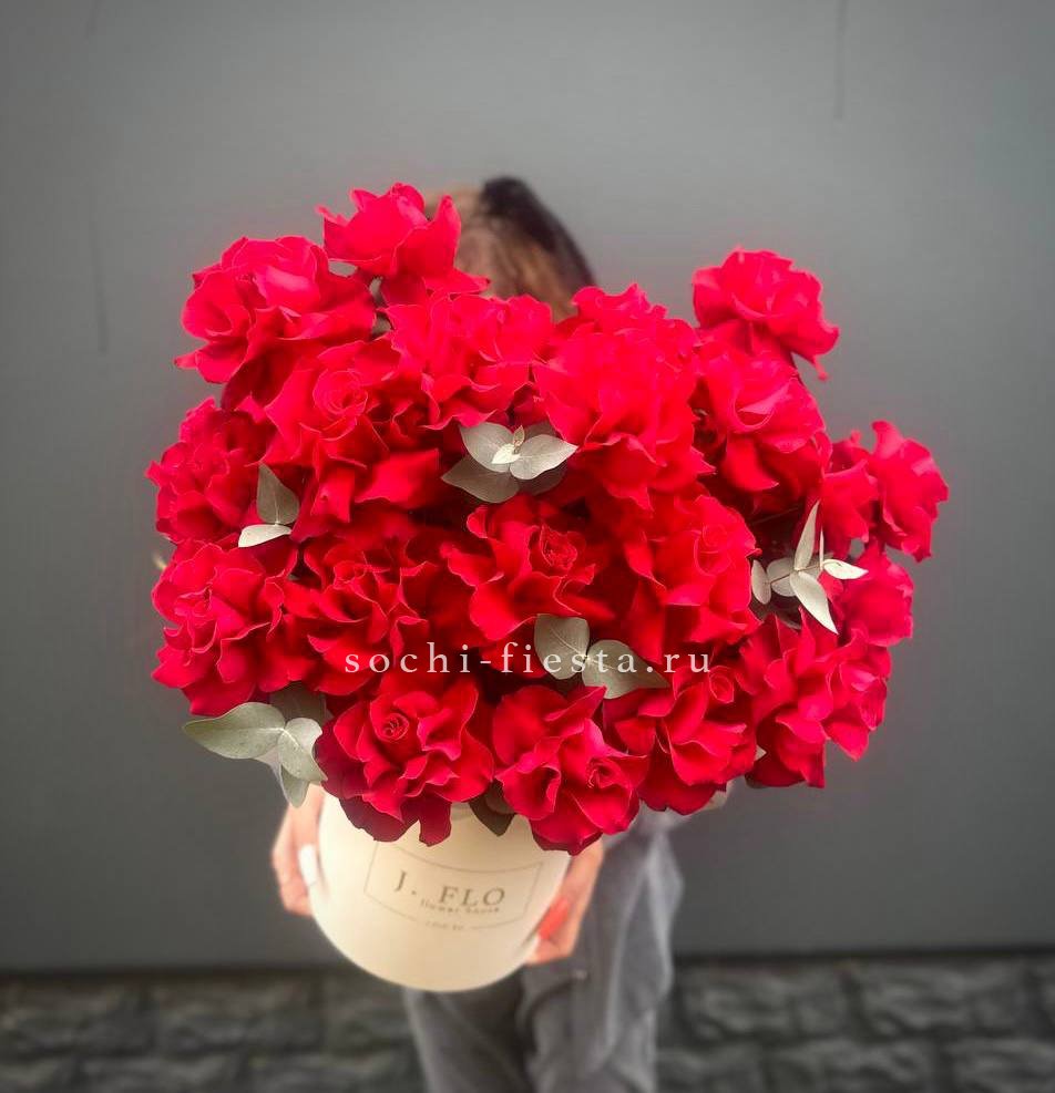 Тридцать пять бутонов с развернутыми лепестками создают насыщенное красное пятно в пространстве. Эвкалипт обрамляет композицию и добавляет воздуха между цветками.