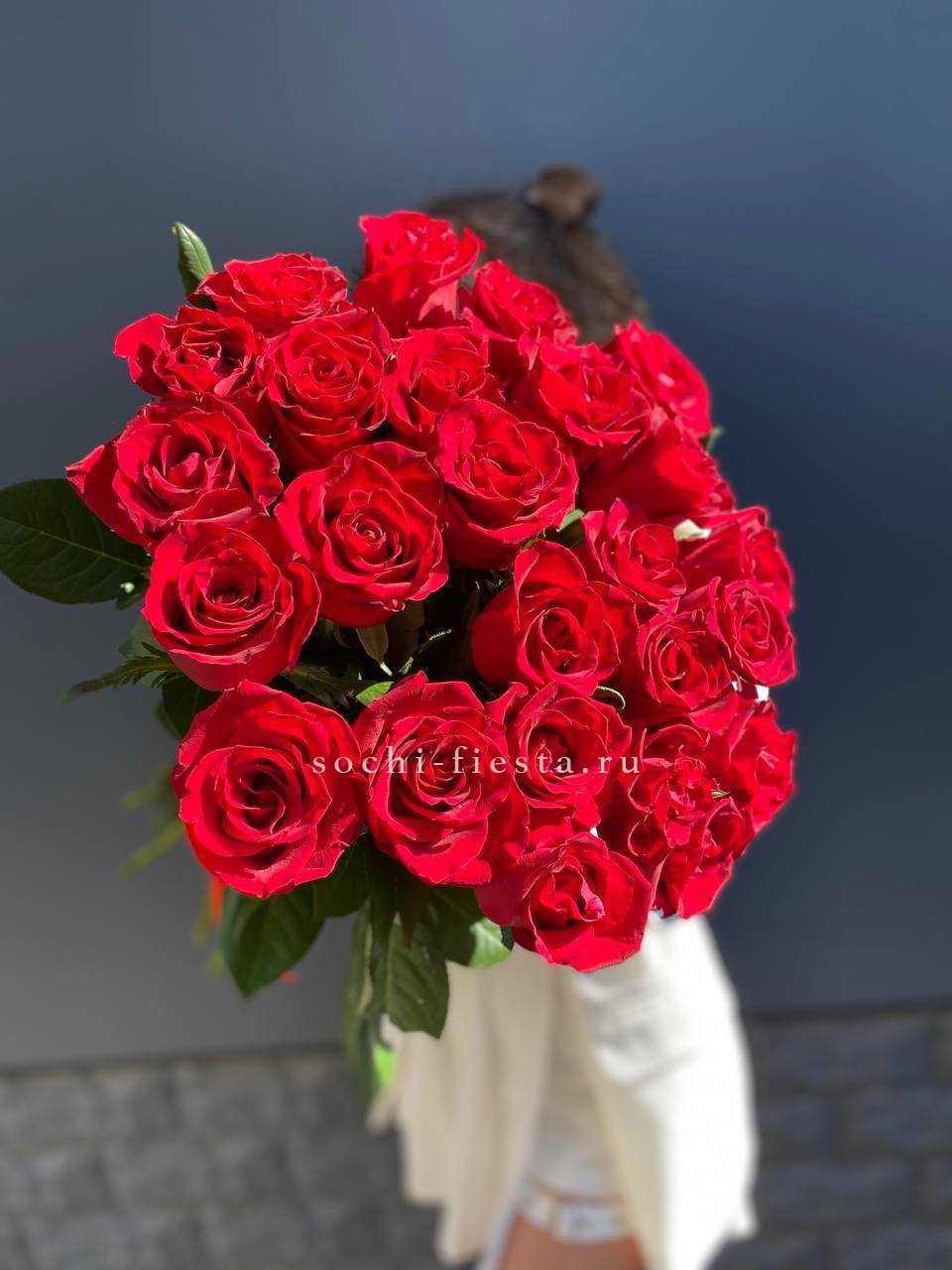 Двадцать пять красных роз с длинными стеблями держат форму и долго радуют свежестью. Классическая красная гамма звучит уверенно и ярко в любой обстановке.