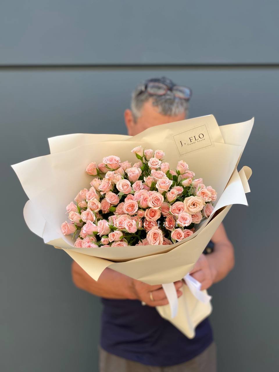 Плотная сборка из множества соцветий формирует округлый силуэт с четким контуром. Кустовые розы создают густую текстуру, где каждая ветвь добавляет объем и завершенность всей композиции.