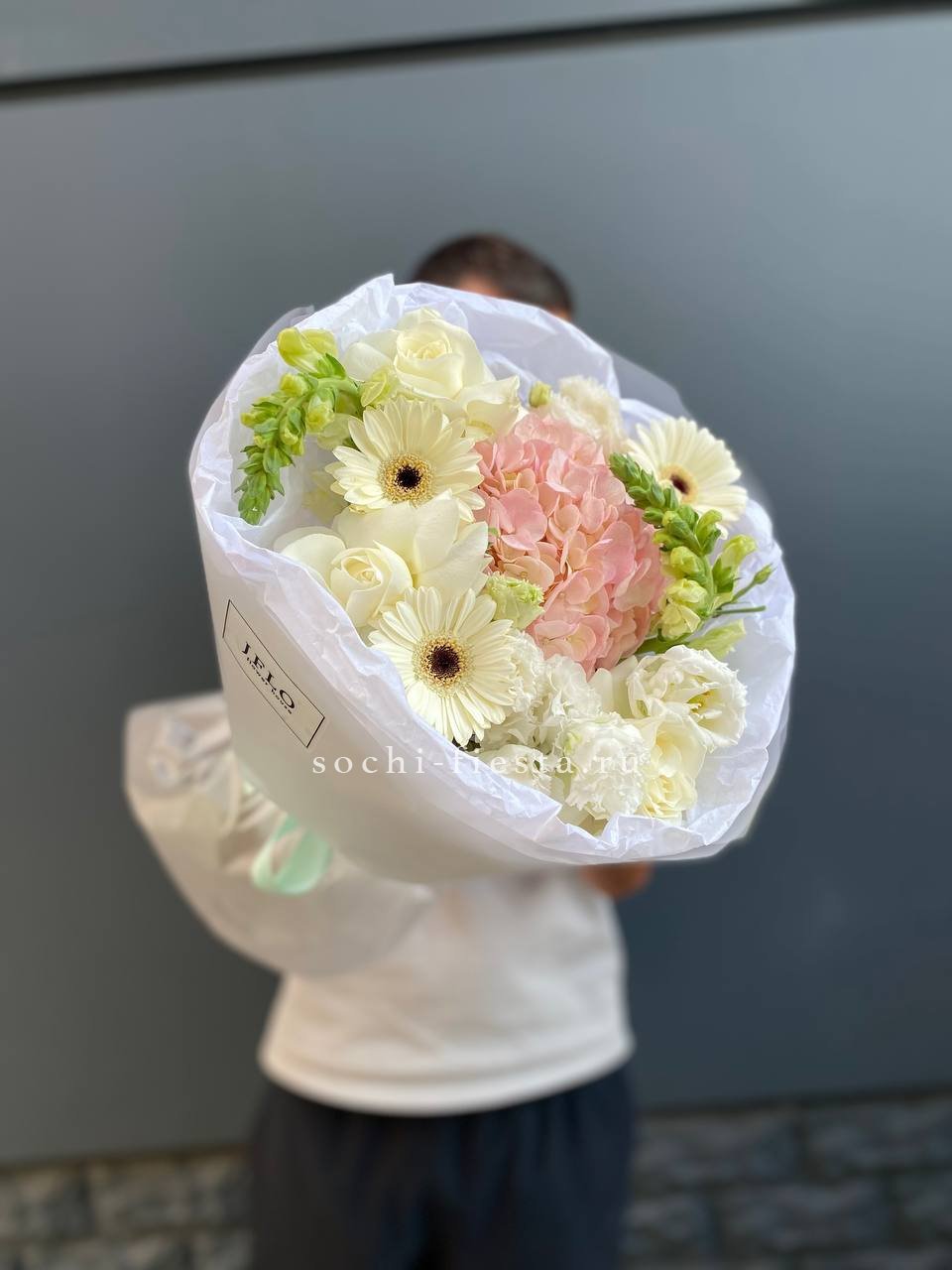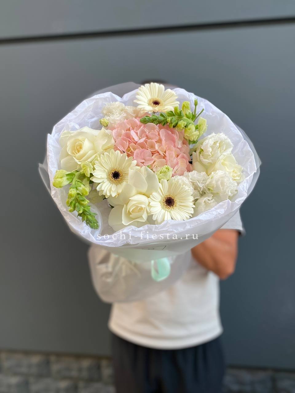 Плотная сборка с пышными соцветиями гортензии и яркими герберами создает объемный силуэт. Маттиола и лимониум добавляют воздушности по краям, а диантусы заполняют центр мягкими переходами.