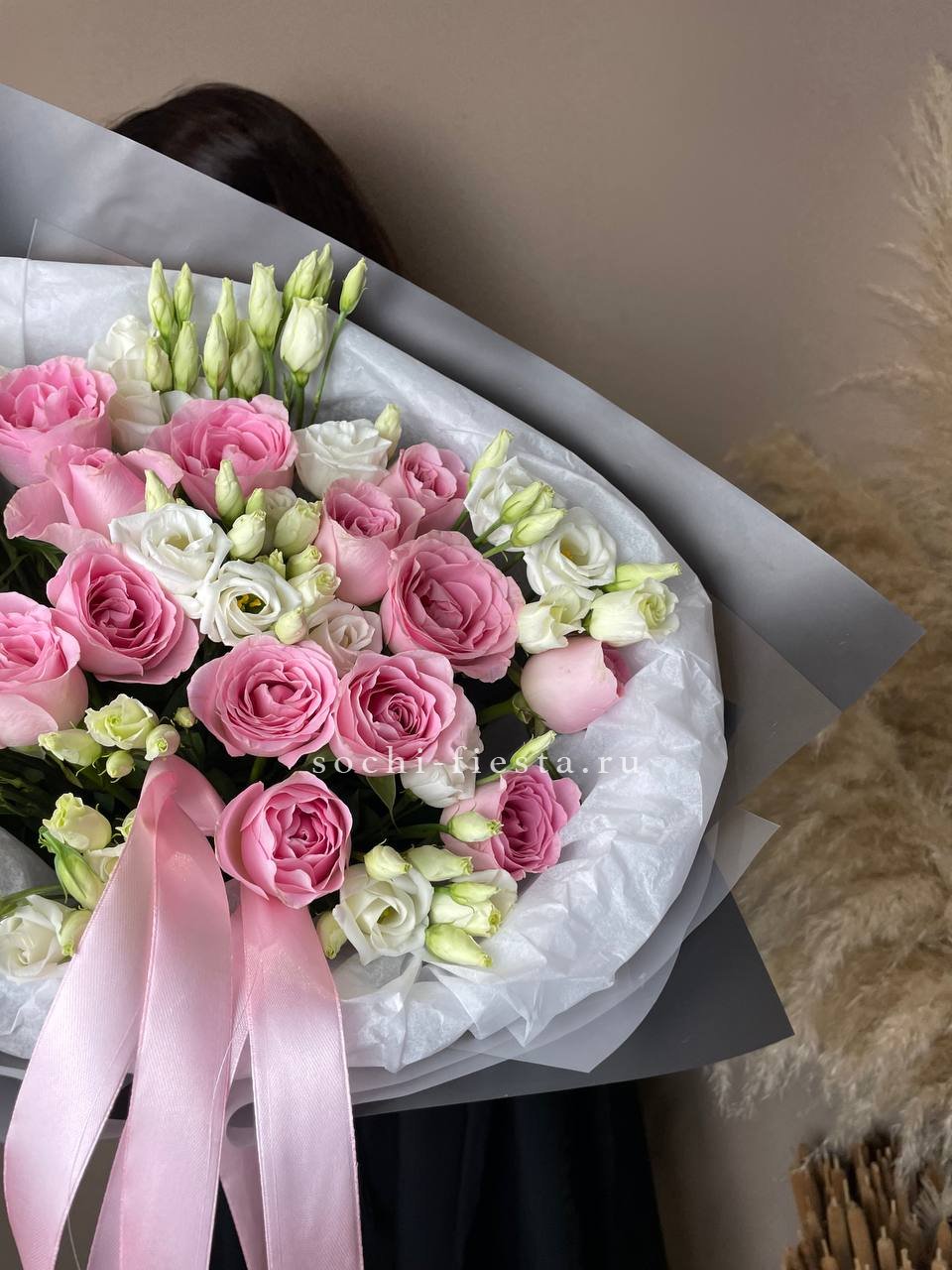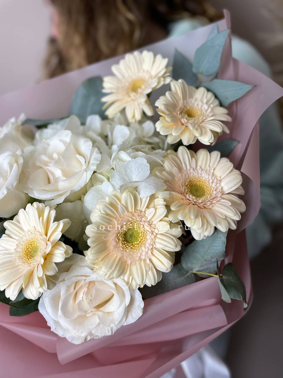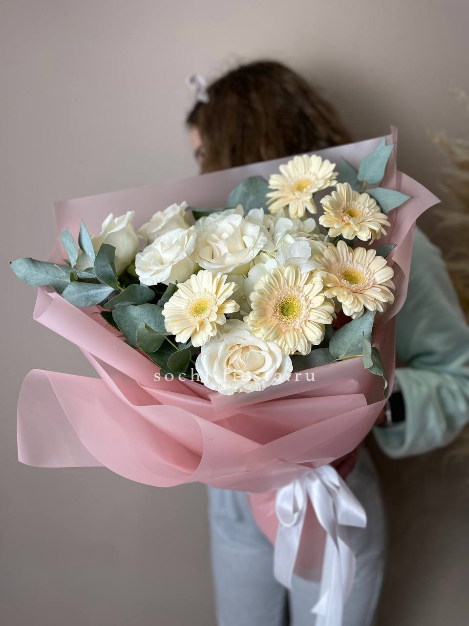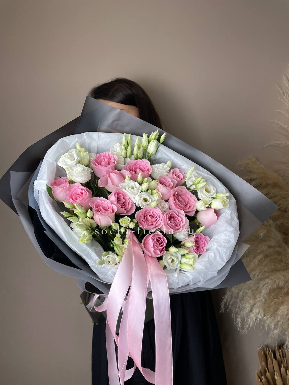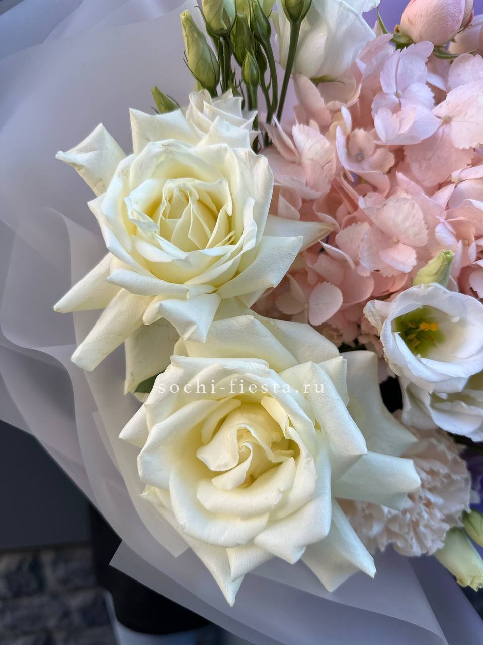 Белые розы и эустома образуют воздушный объем, где каждый бутон дышит свободно. Диантус добавляет графичности, а эвкалипт создает прохладную дымку по краям. Букет для тех, кто ценит легкость и современную флористику.