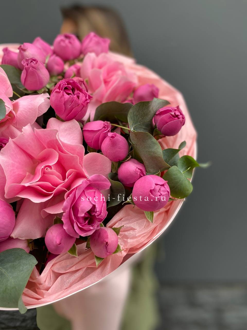 диантус, бомбастик, белые розы, эвкалипт, эустома, упаковка.