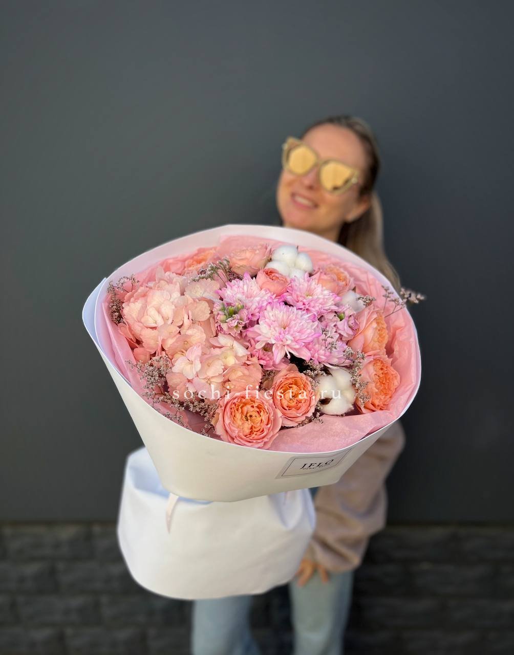 Пионовидные розы Джульетта с пышными шапками гортензии создают плотную композицию в пудровой гамме. Хлопок и лимониум добавляют воздушности, а кустовая хризантема заполняет пространство между крупными бутонами. Букет держит форму и долго сохраняет свежесть.