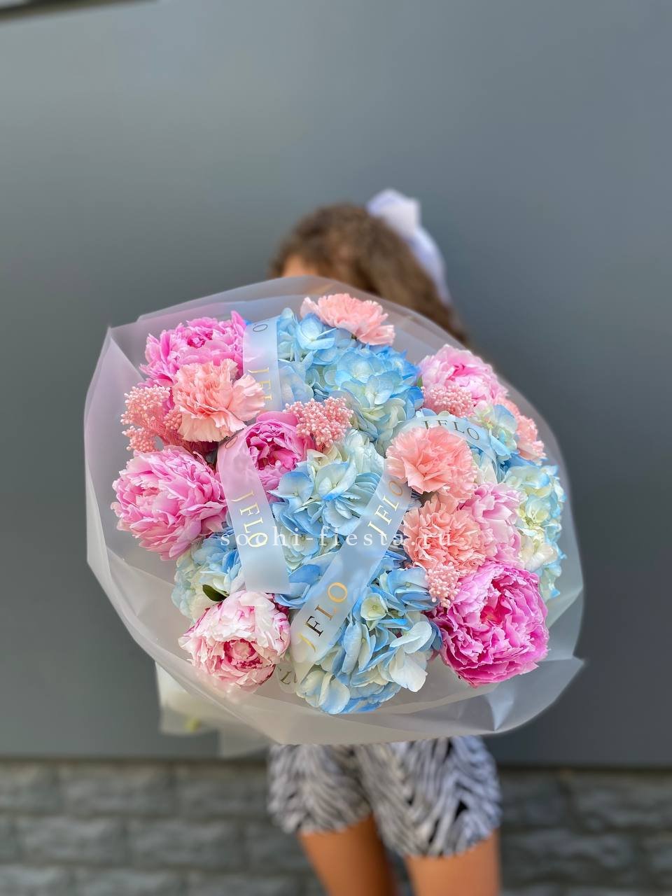 пионы, озатамус, гортензии, диантусы, лента и дизайнерская пленка.