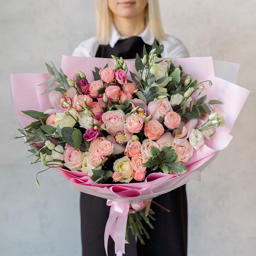 Пышные головки пионовидных роз соседствуют с воздушной эустомой и графичной орхидеей цимбидиум. Эвкалипт добавляет свежести, а дизайнерская упаковка завершает композицию с выразительным объёмом.