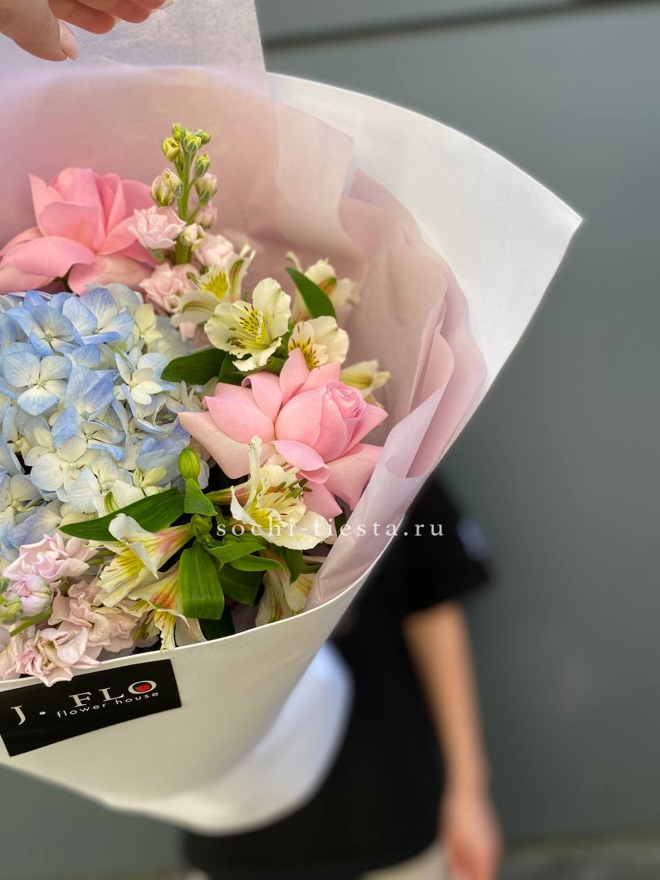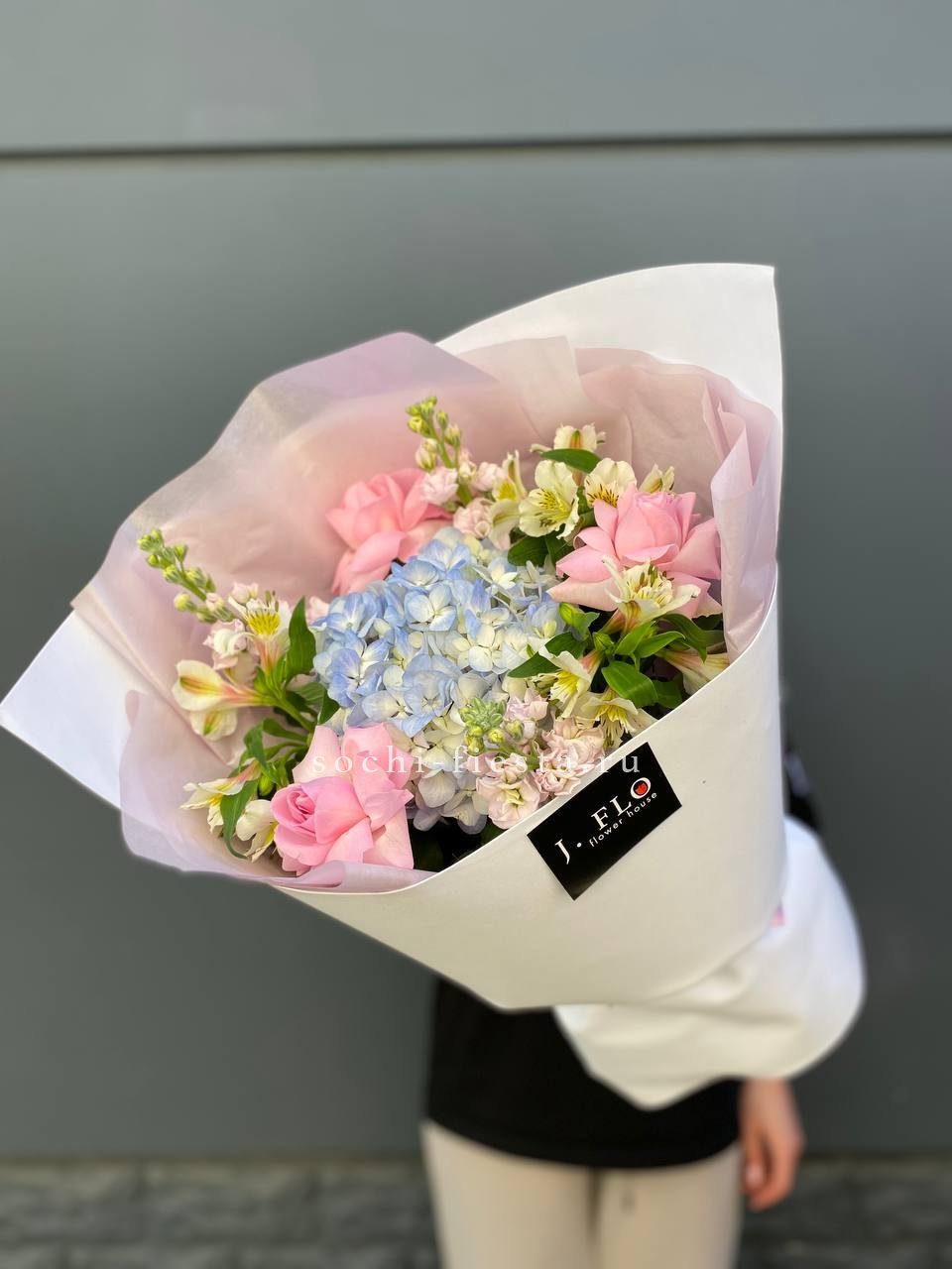 Воздушная композиция с крупными соцветиями гортензии и пышными розами создает ощущение легкости и объема. Эвкалипт добавляет свежести, а бомбастик расставляет яркие акценты между бутонами.